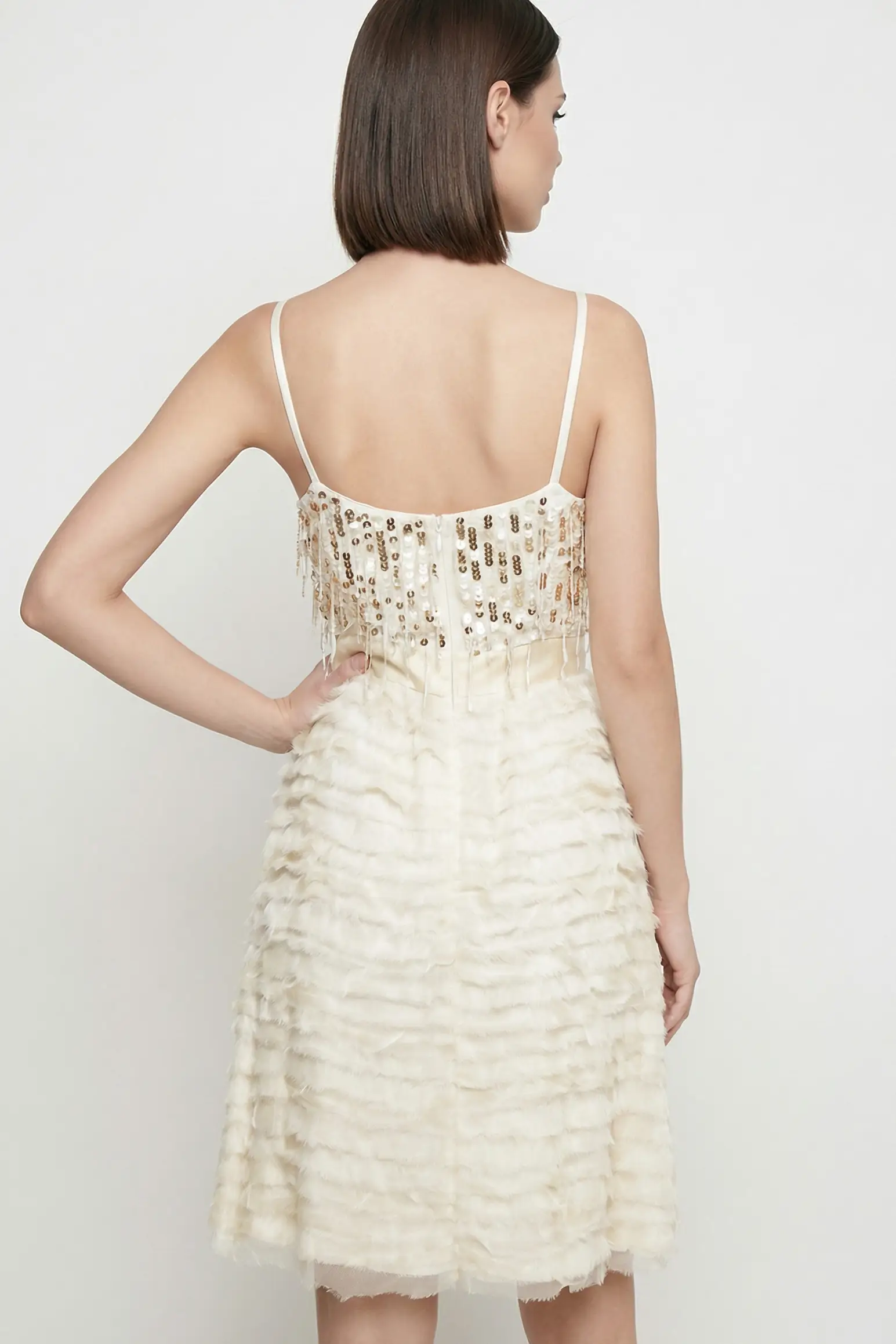 Details: Sleeveless, hand-embroidered appliqués, lined interior