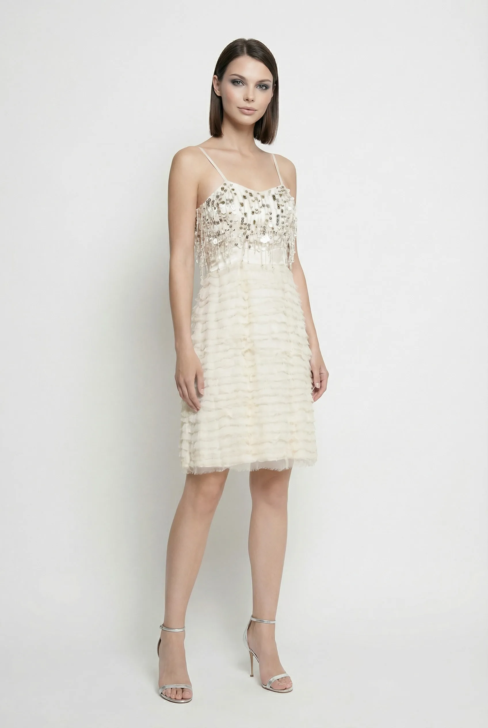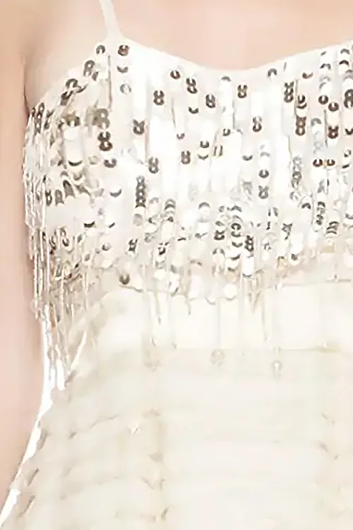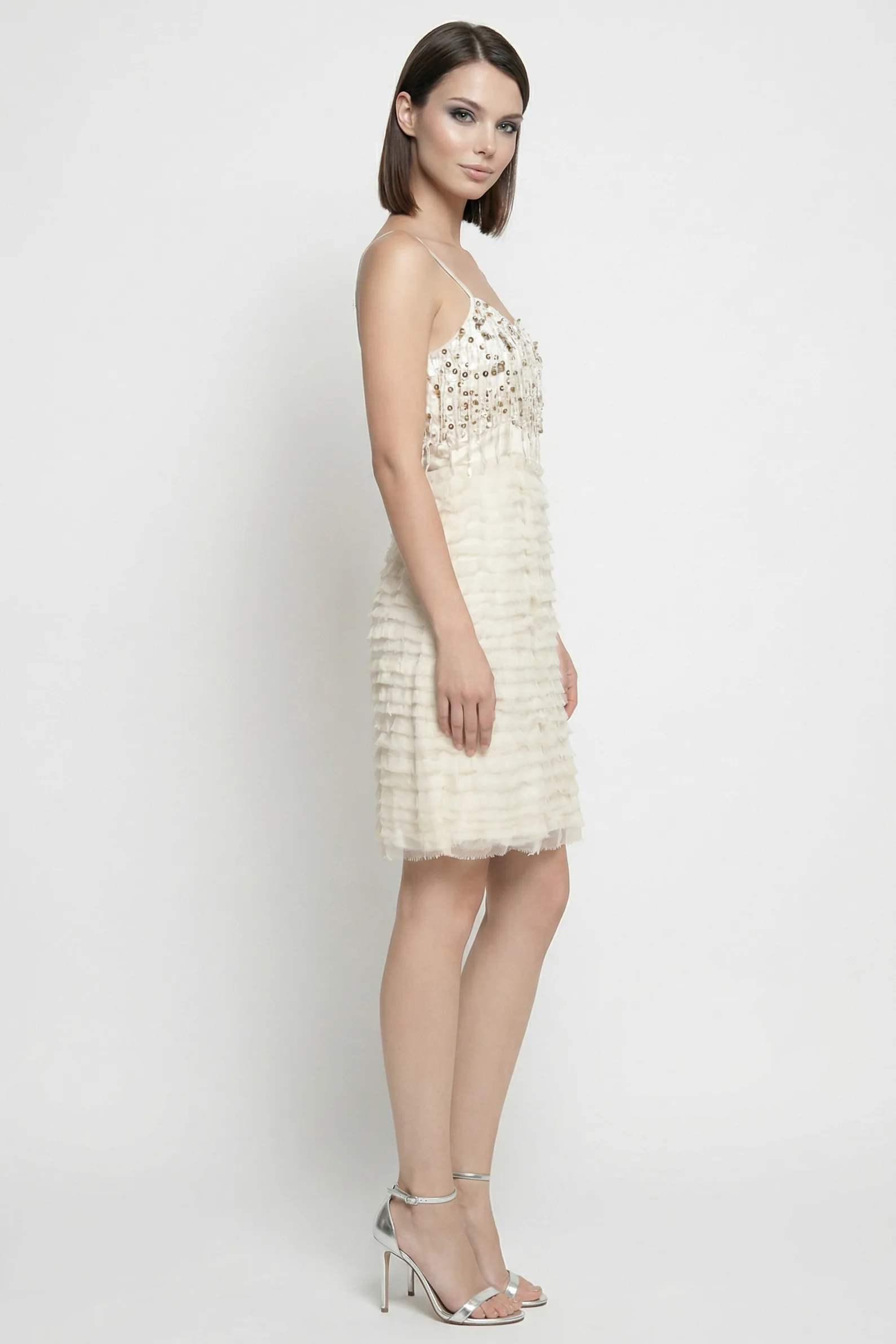 Esalta la tua eleganza con l’BLUGIRL by BLUMARINE ceremony dress in una raffinata tonalità avorio. Questo esclusivo modello smanicato si distingue per il corpetto ricamato a mano con strass e paillettes luminose e una gonna a balze orizzontali in viscosa, offrendo una vestibilità impeccabile per la taglia IT 42 (M).