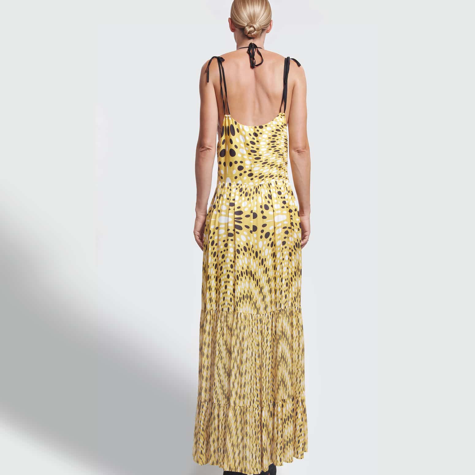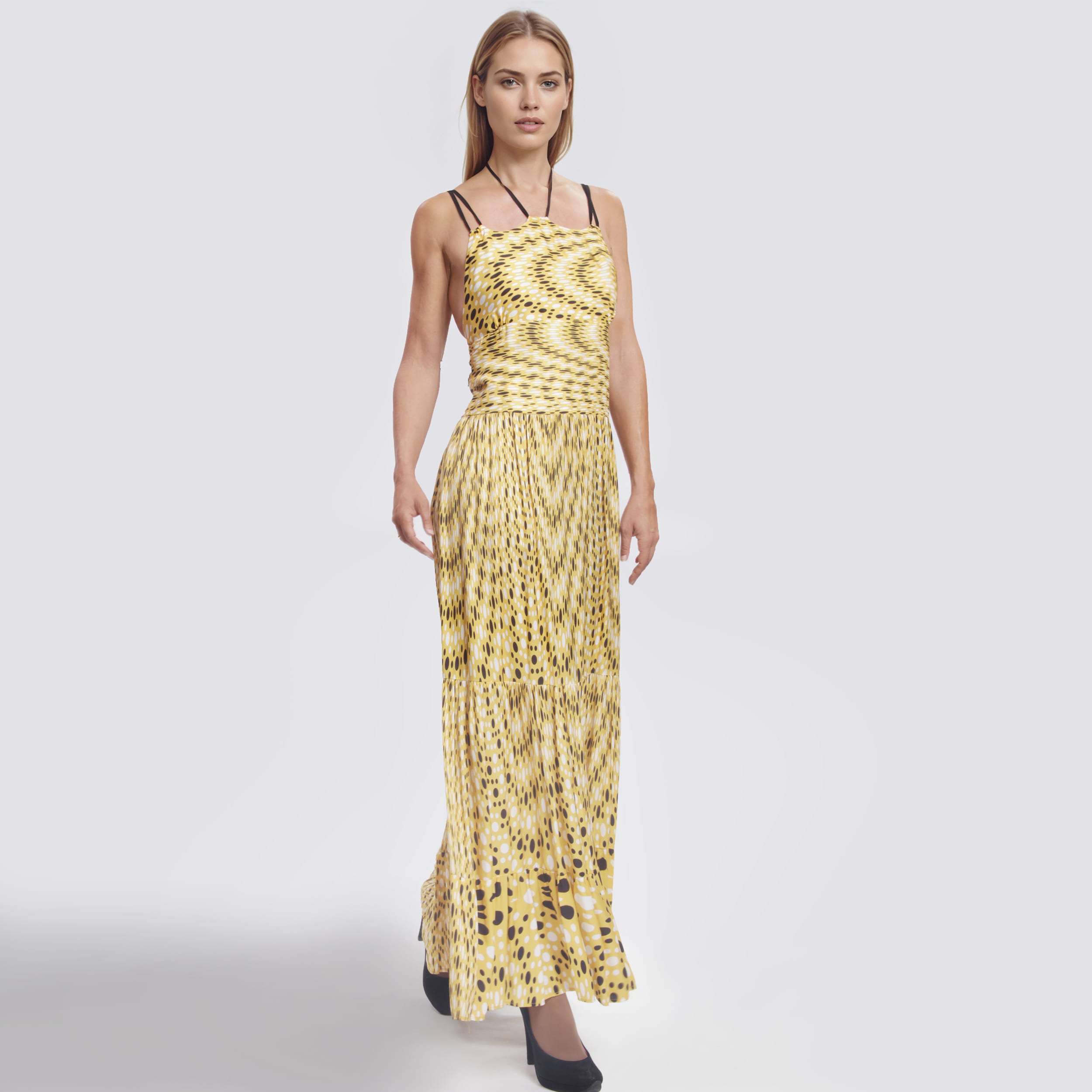 Dynamic Elegance: The Beatrice B Yellow 44 Long Dress L’Beatrice B yellow dress 44 is an ode to Italian creativity. This maxi dress catches the eye with a black and white polka dot pattern on a deep yellow background, creating a modern and refined optical effect. The design is intended for comfort without sacrificing style: the epaulettes with laces and neck fastening allows you to adjust the height and neckline to suit your silhouette.