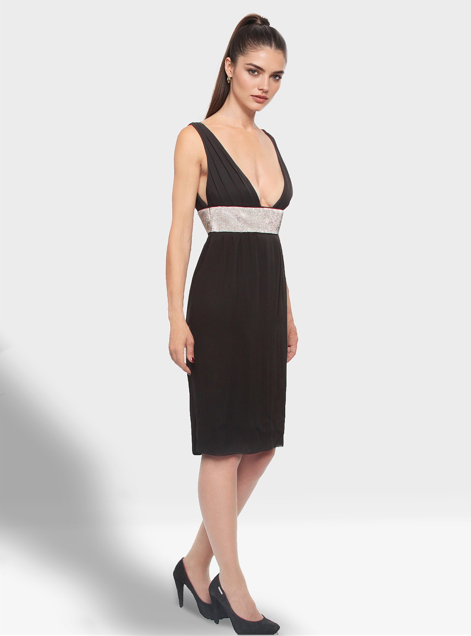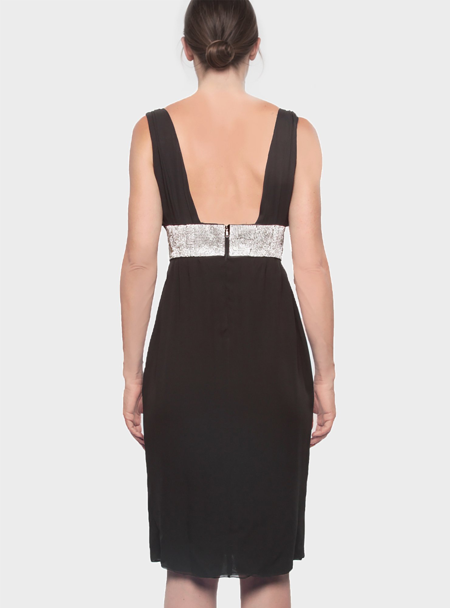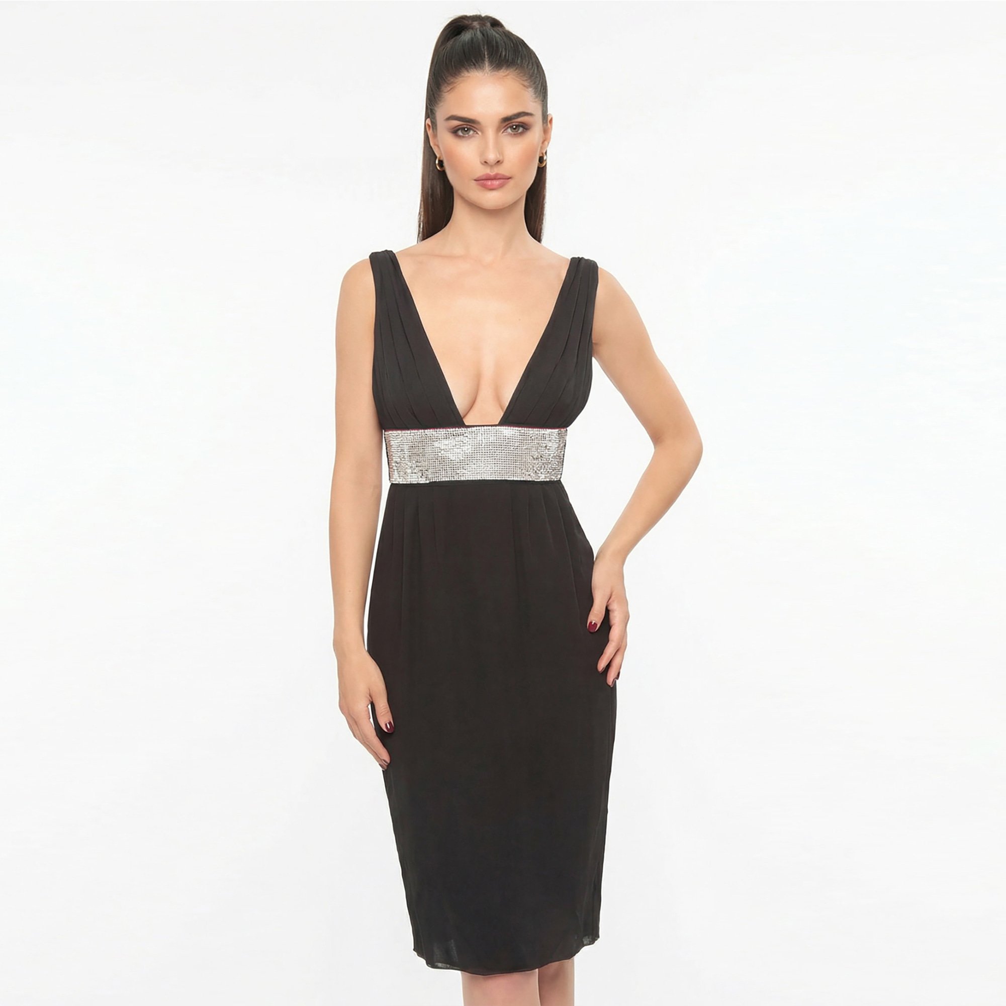 Discover the timeless charm of the black elegant dress for women John Richmond, a high-fashion garment made of 100% silk. The sophisticated and sensual design, characterised by the deep V-neck and the jewel band waist makes it ideal for special evenings, ceremonies or exclusive events.