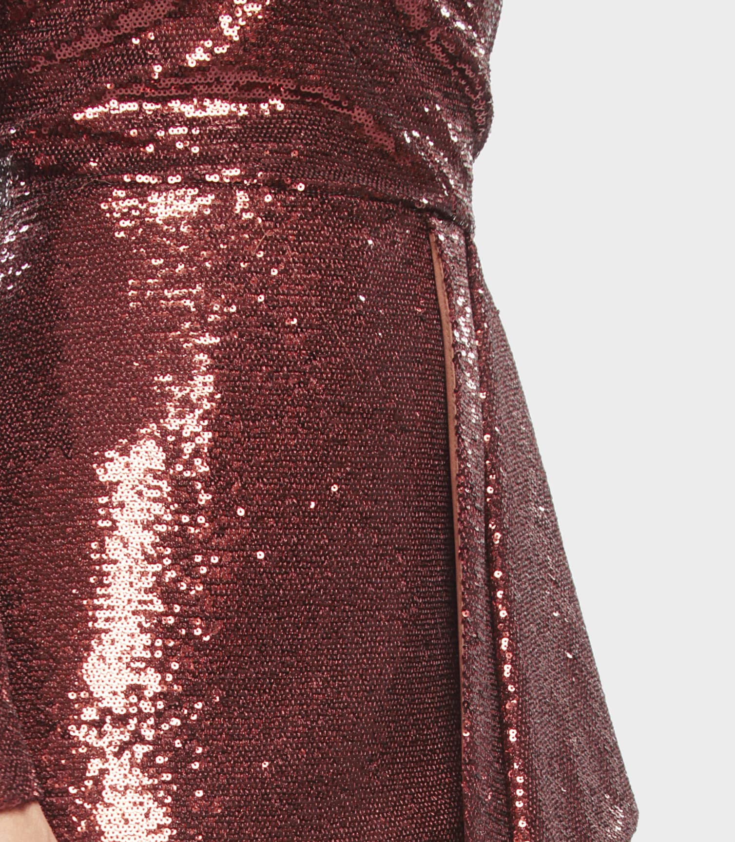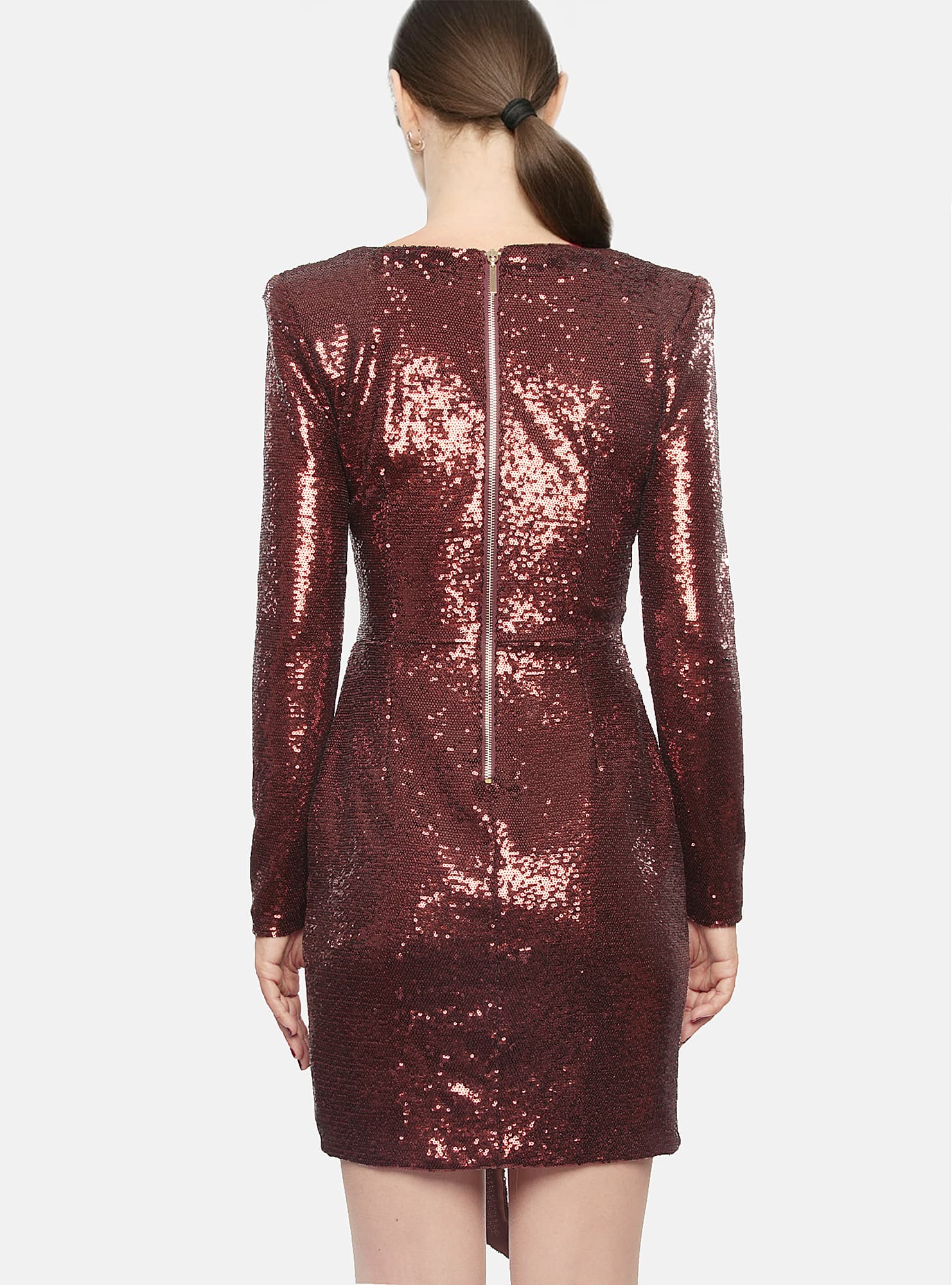 Elegant women's Gil Santucci dress in copper sequins, V-neck, long sleeves and back zip. Perfect for ceremonies, parties or galas.