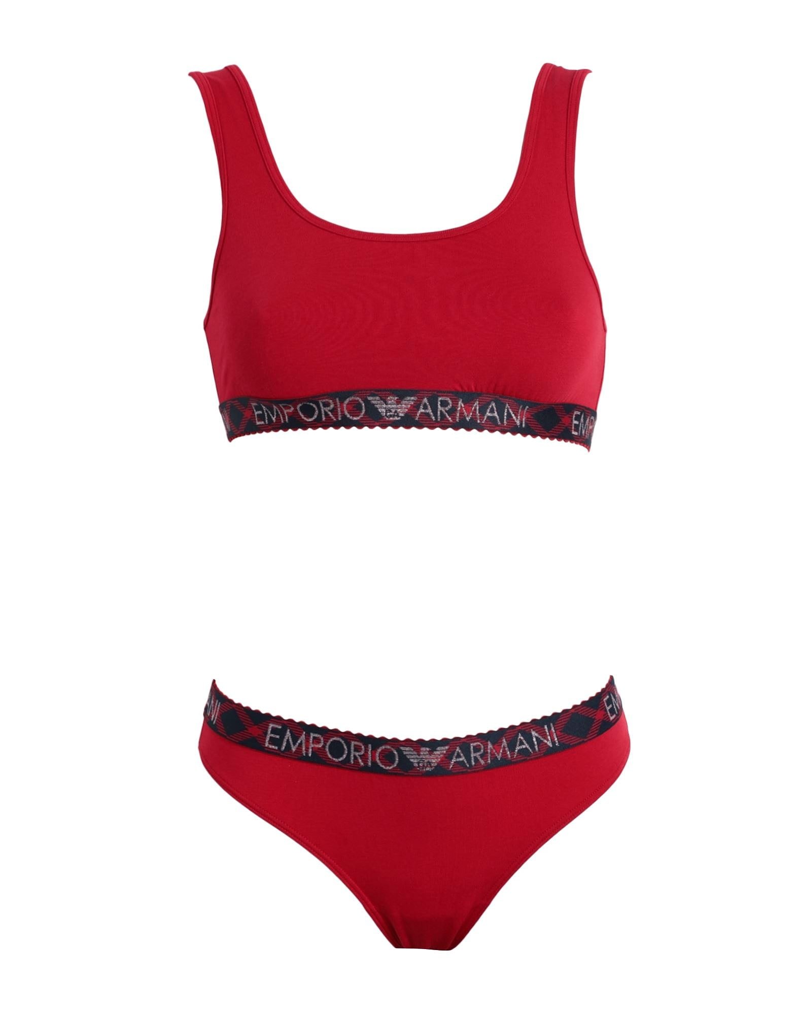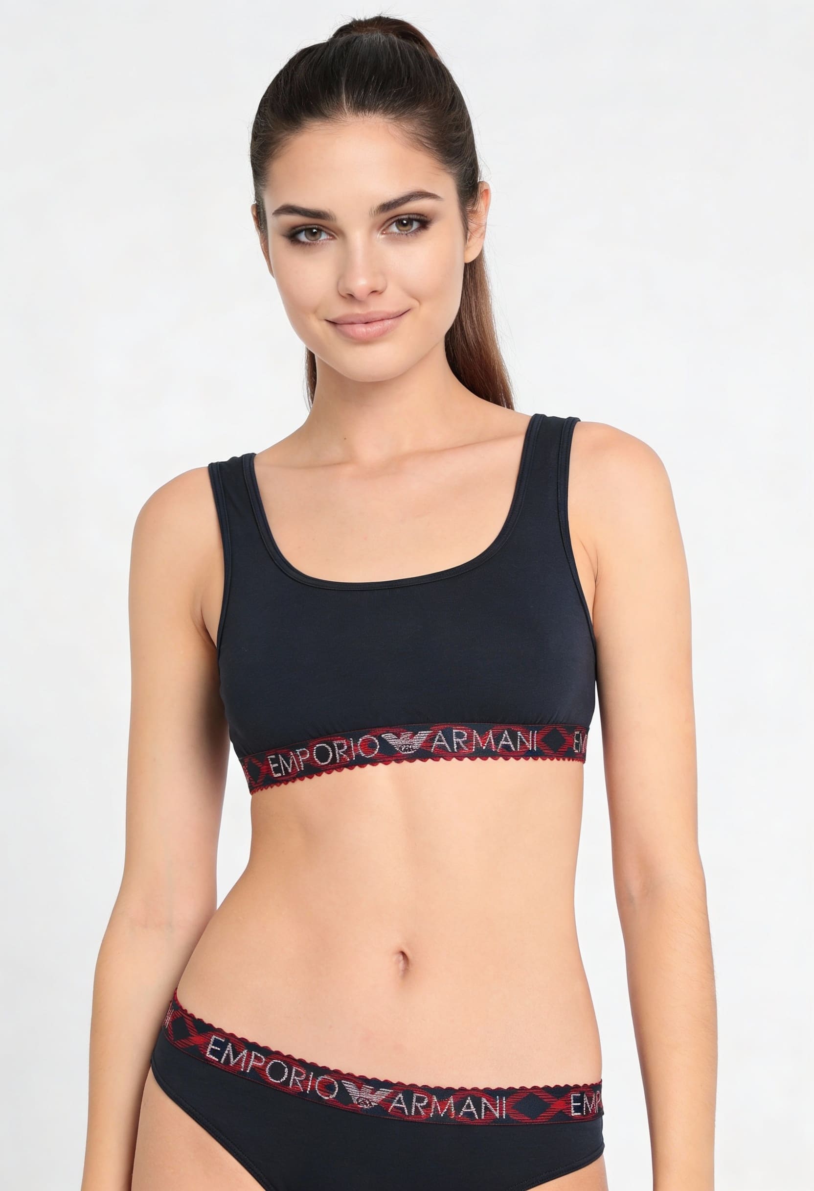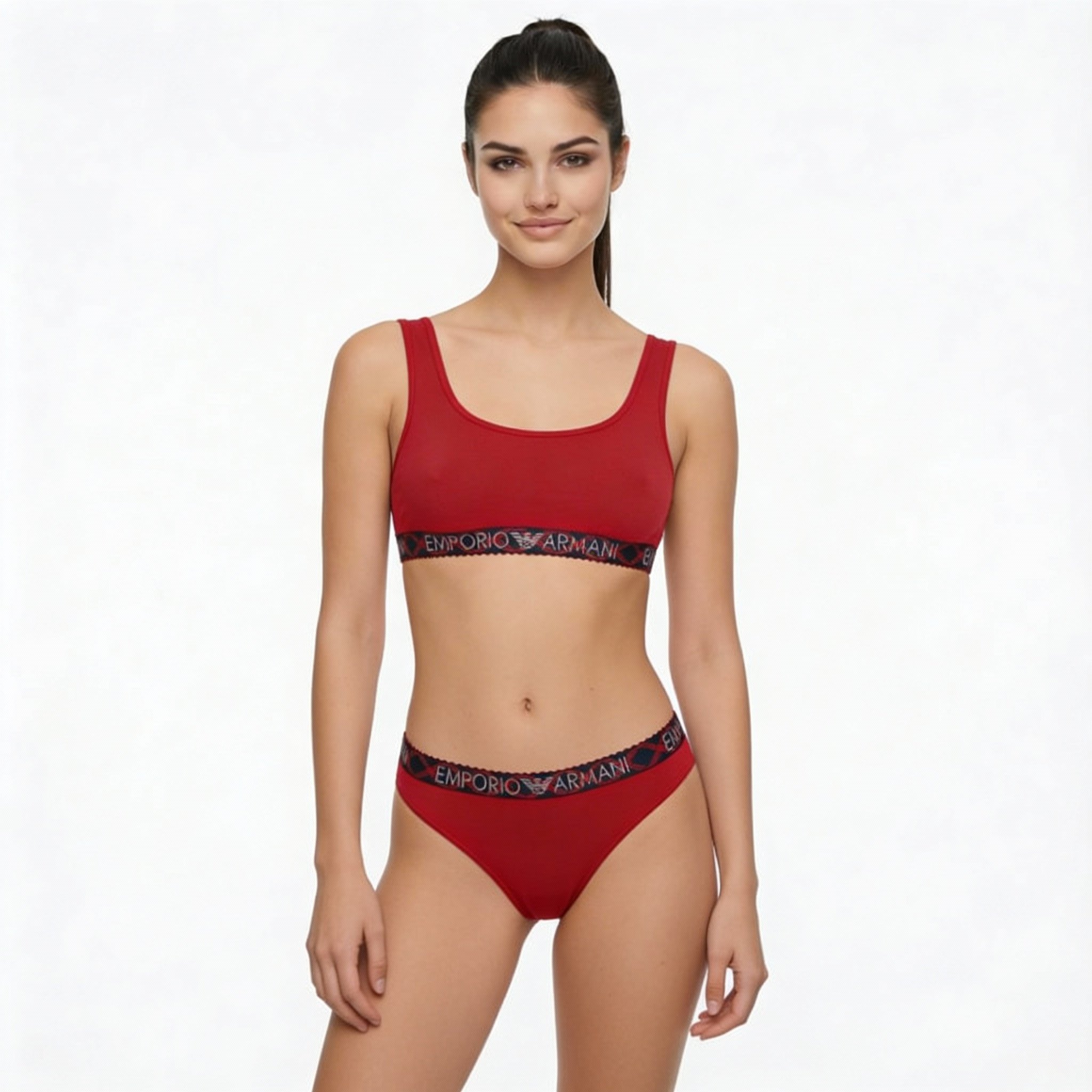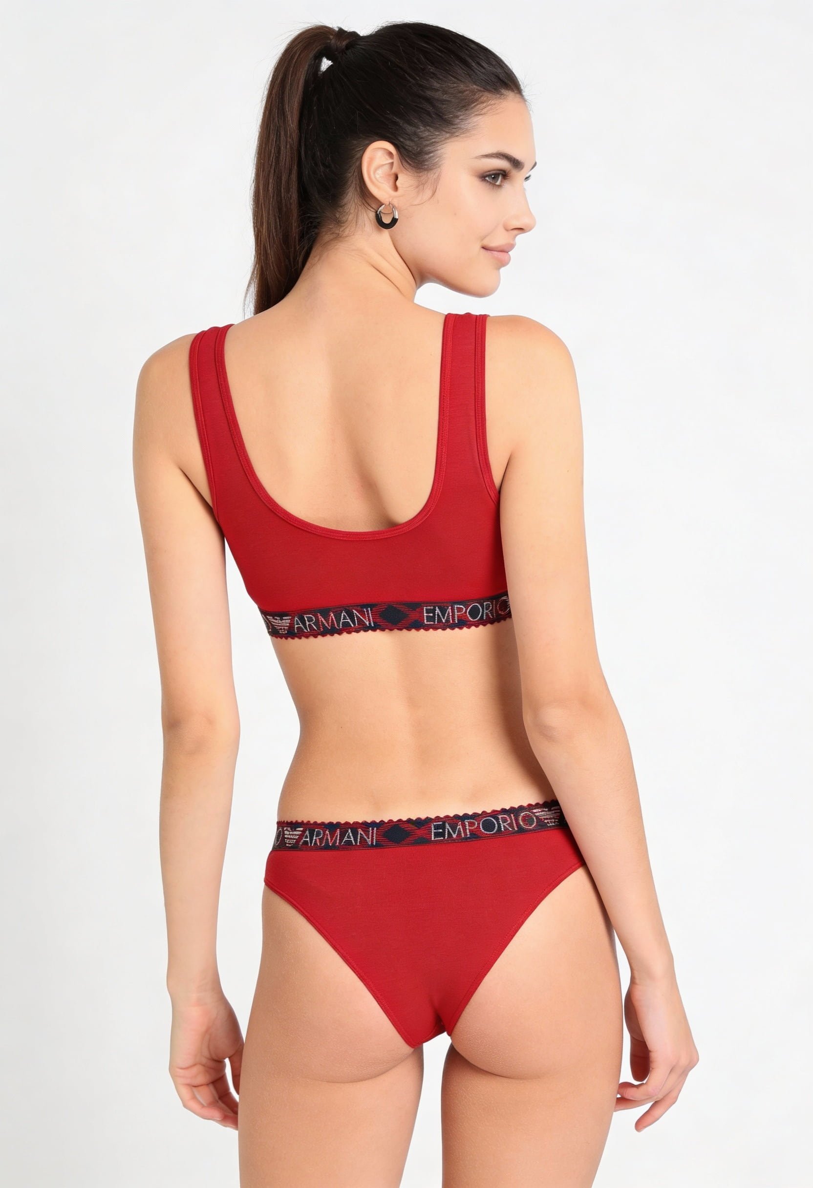 The distinctive element of this Emporio Armani underwear set is the elastic underbust and waistband, embellished with the embroidery of the “Emporio Armani” logo with the iconic eagle. The addition of metal fibres in the weave of the elastic gives a bright, metallic touch that enhances the vibrancy of the red. The set includes a sleeveless bralette with a round neckline and a brief with a modern cut, making it ideal both for leisure time and for a sport-chic underwear look. In addition to the red variant, the set is also available in a classic dark blue to suit every style need.