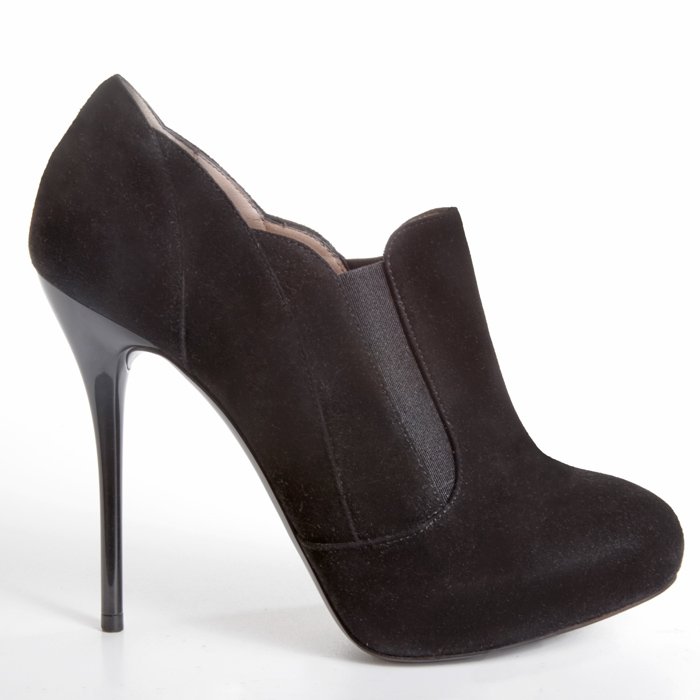 The Wavy Profile Suede Pumps designed by Ernesto Esposito, this shoe is a masterpiece of sensuality and contemporary design. Crafted from refined black suede, it features a 12 cm stiletto heel and a unique wavy profile, enhanced by an elasticated band for a perfect fit.