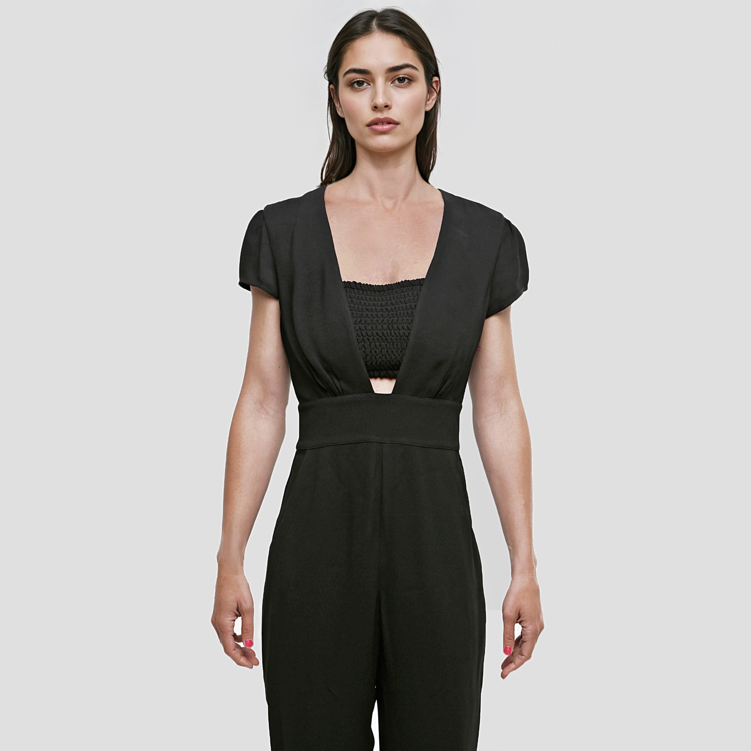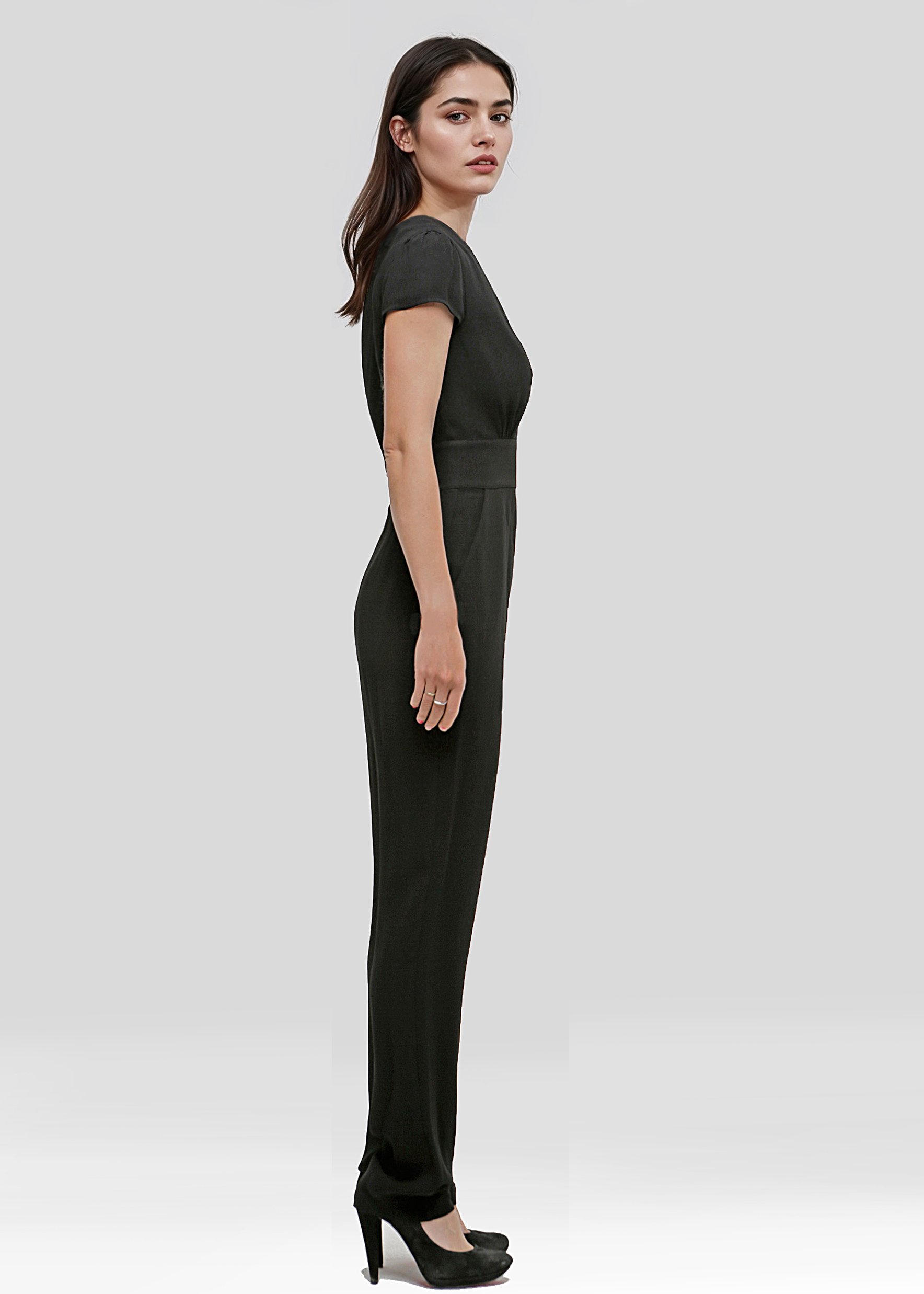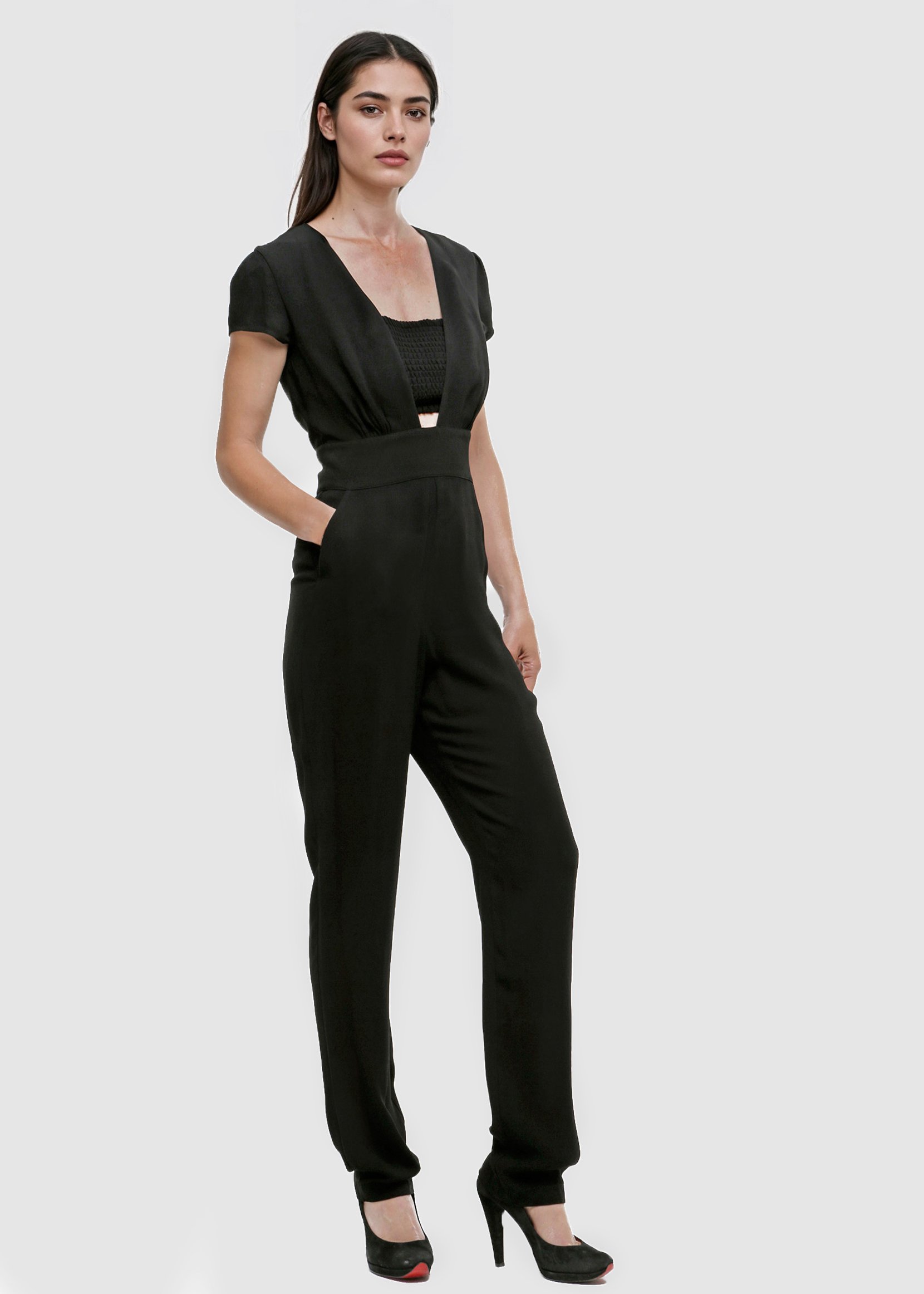 Elegant Giorgio Armani women's trouser suit black viscose with V-neckline, short sleeves, removable elasticated bandeau top, back zip and regular fit. Refined and modern jumpsuit, ideal for events and chic looks.