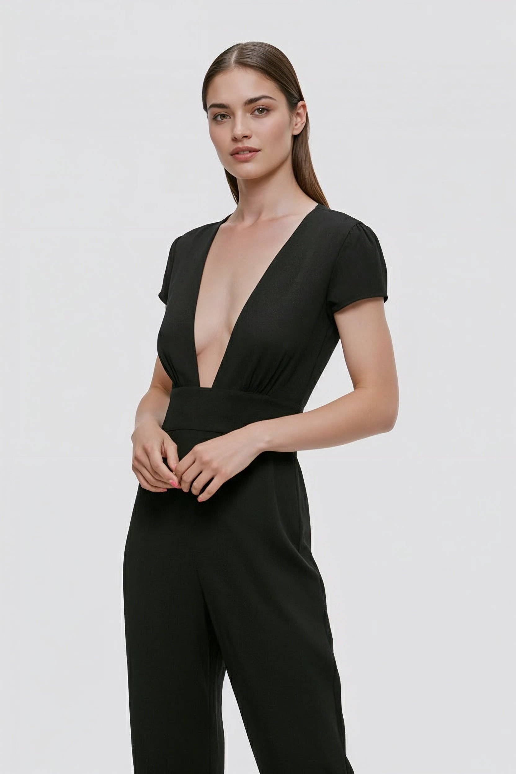 L’ Giorgio Armani women's trouser suit is an elegant and modern garment designed for those who desire a refined and timeless style. This Armani women's black tracksuit at 100% viscose offers a fluid, comfortable and sophisticated fit, ideal for special occasions, elegant dinners and formal events. The design of the Armani women's trouser suit presents a wide V-neckline, short sleeves and a clean line that enhances the silhouette with balance and naturalness.