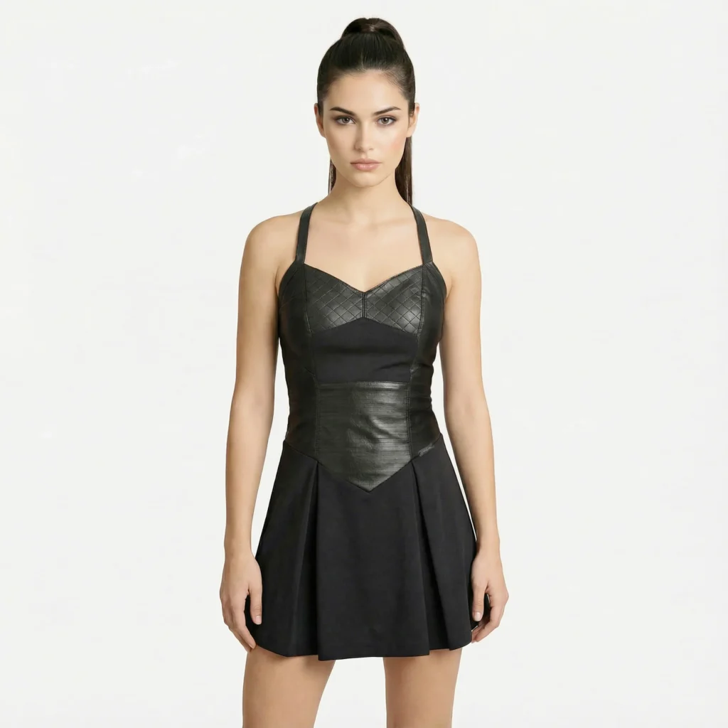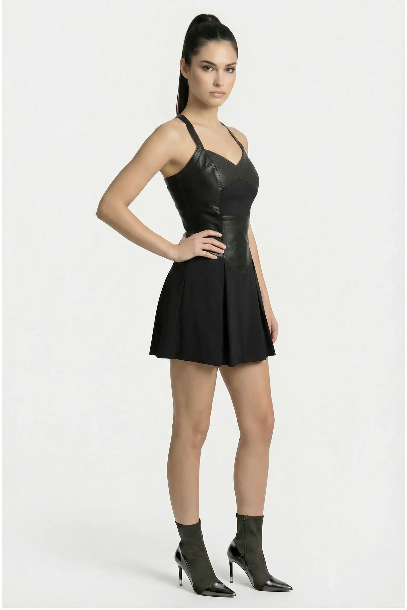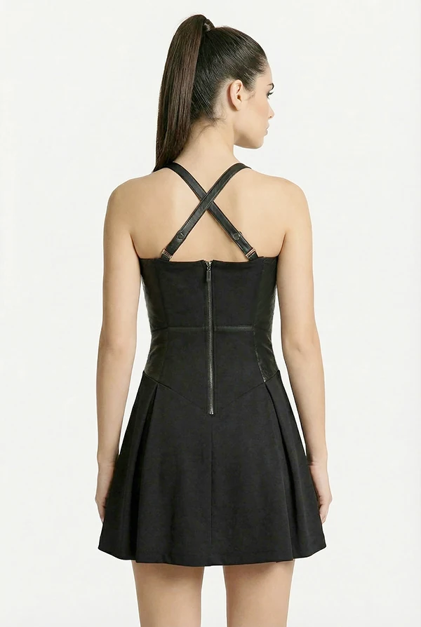 Assert your style with the KORALLINE short dress, A feisty model featuring faux leather inserts and a low-cut design. Perfect for size XS, this black dress offers adjustable straps for a customised look, ideal for those looking for a modern, figure-flattering outfit with a regular fit.
