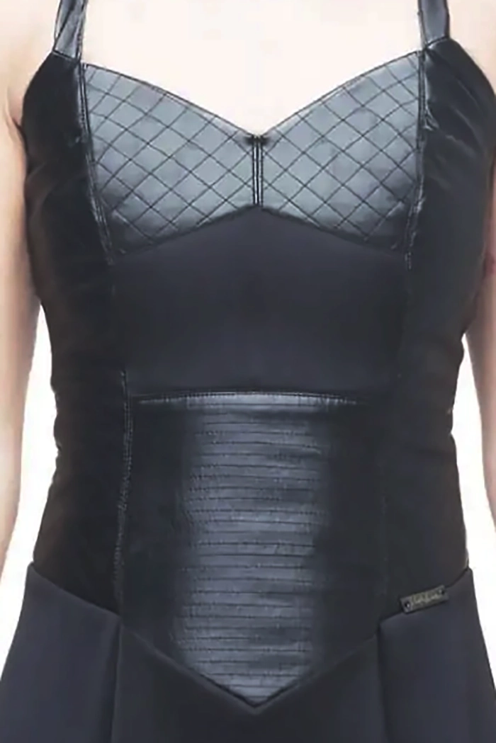 The KORALLINE short dress is the must-have garment for the woman who is not afraid to dare with rock-chic details. Made of an elastic mix of polyamide (90%) and elastane (10%), this dress guarantees optimal freedom of movement while maintaining a defined structure. The deep black shade enhances the textural contrast created by the faux leather insert strategically placed on the bodice and waist, making the KORALLINE short dress a one-of-a-kind piece.