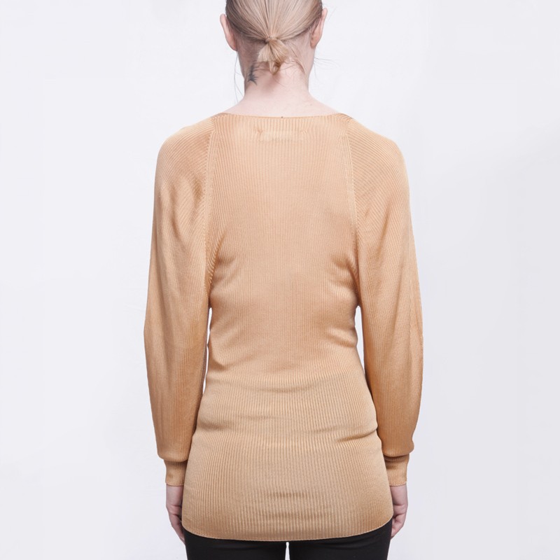 Raffinata maglia Liviana Conti color senape, realizzata in 100% viscose per una mano setosa e confortevole. Caratterizzata da un profondo scollo a V e una linea essenziale, è il capo perfetto per completare outfit sia formali che casual. International size: M.