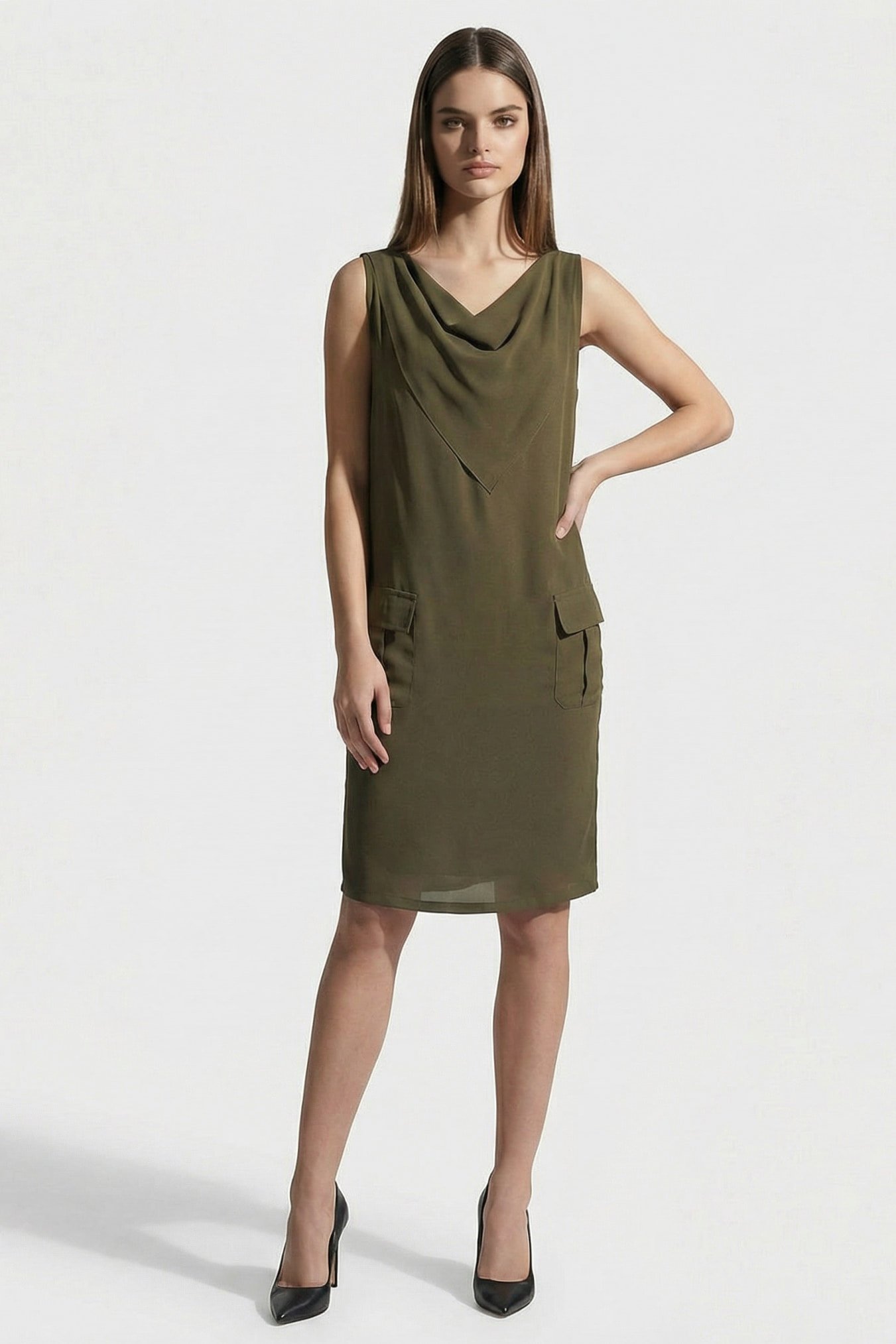 Made in 100% silk, It offers a loose, flowing fit that flatters every silhouette. The design features draped neckline, length midi calf and practical front pockets.