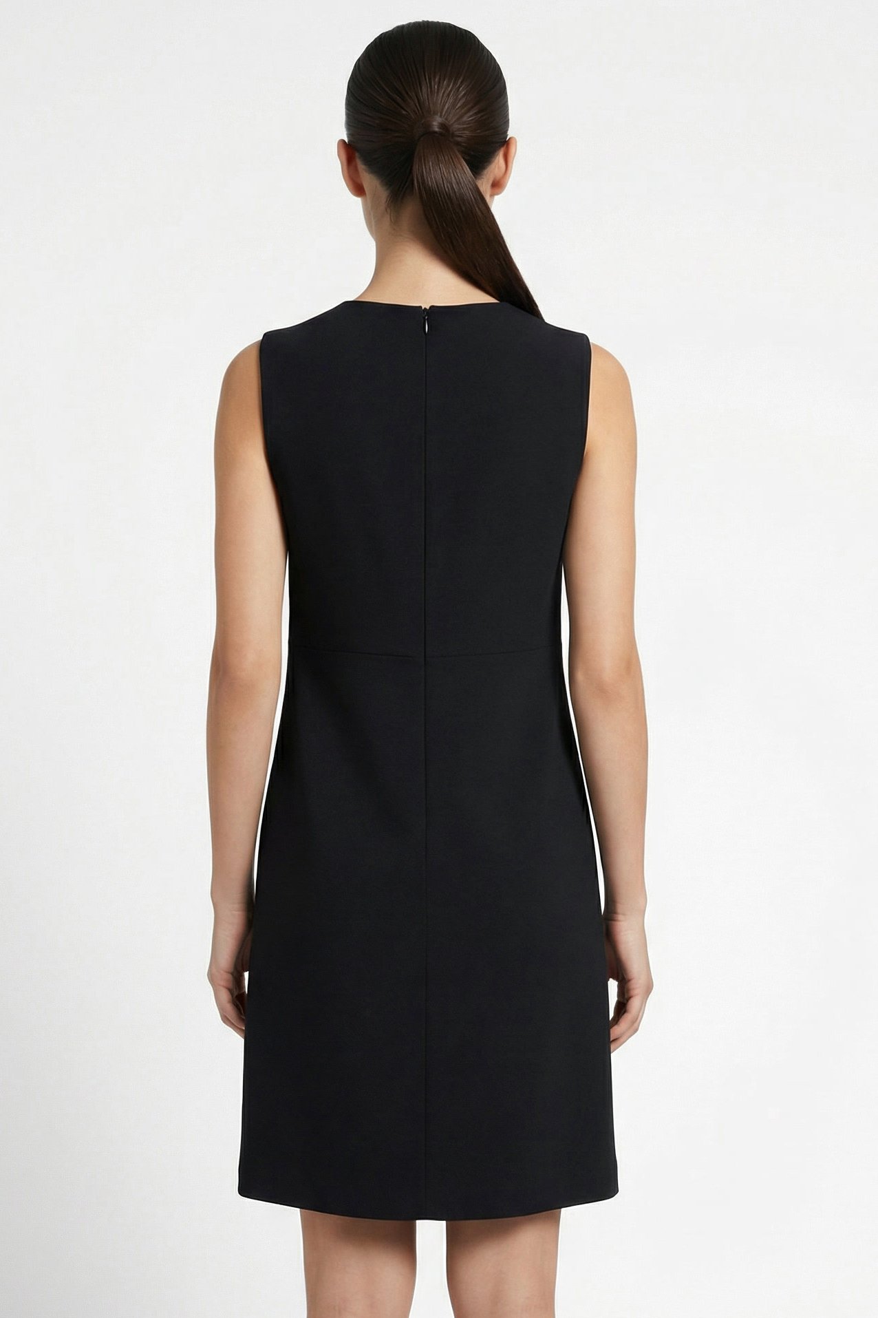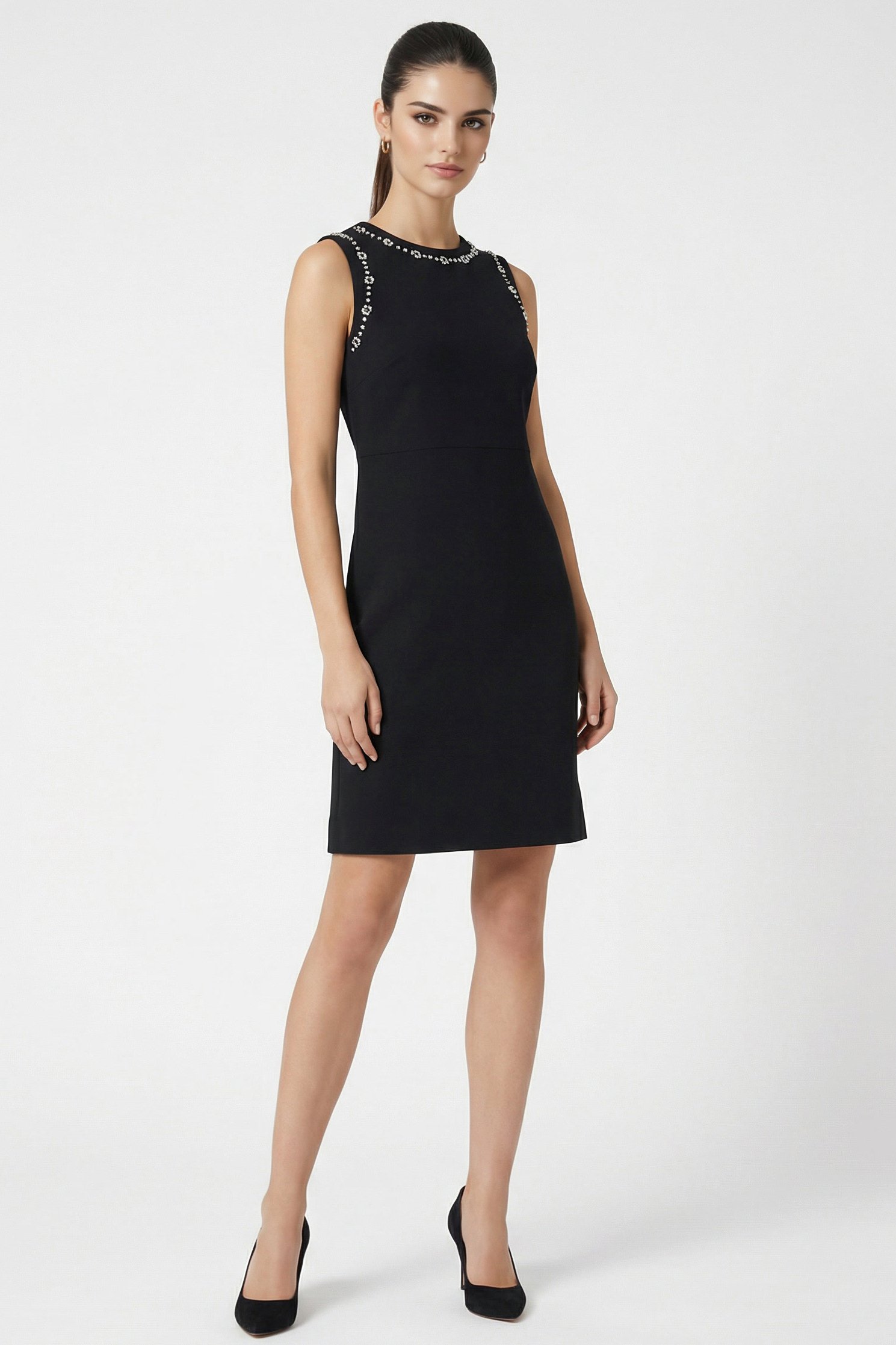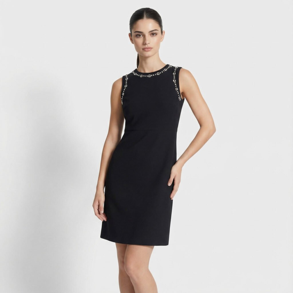 Max Mara women's black sheath dress with rhinestones on the neckline. Elegant, sleeveless, knee length and back zip.