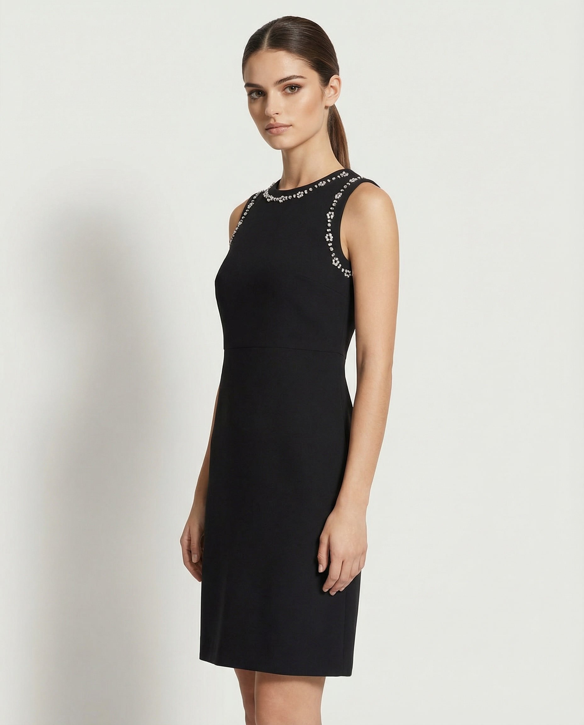 TheMax Mara women's black sheath dress is an elegant model with rhinestone applications on the neckline. The black sheath dress is sleeveless, has a back zip fastening and is knee-length. Perfect as elegant black dress for women for ceremonies, events or special evenings. Clean line, regular fit and refined style by Max Mara.