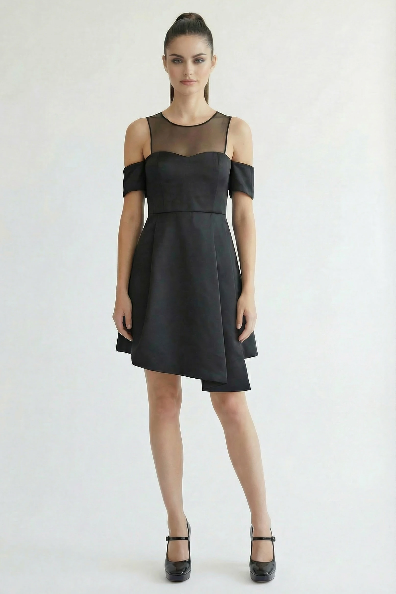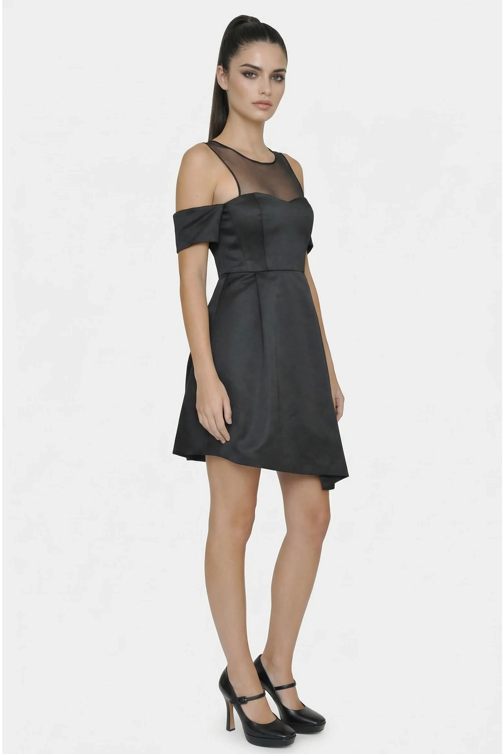 Pinko elegant black dress in duchesse fabric with bare shoulders, tulle and asymmetric skirt. Sophisticated dress for ceremonies and special events.