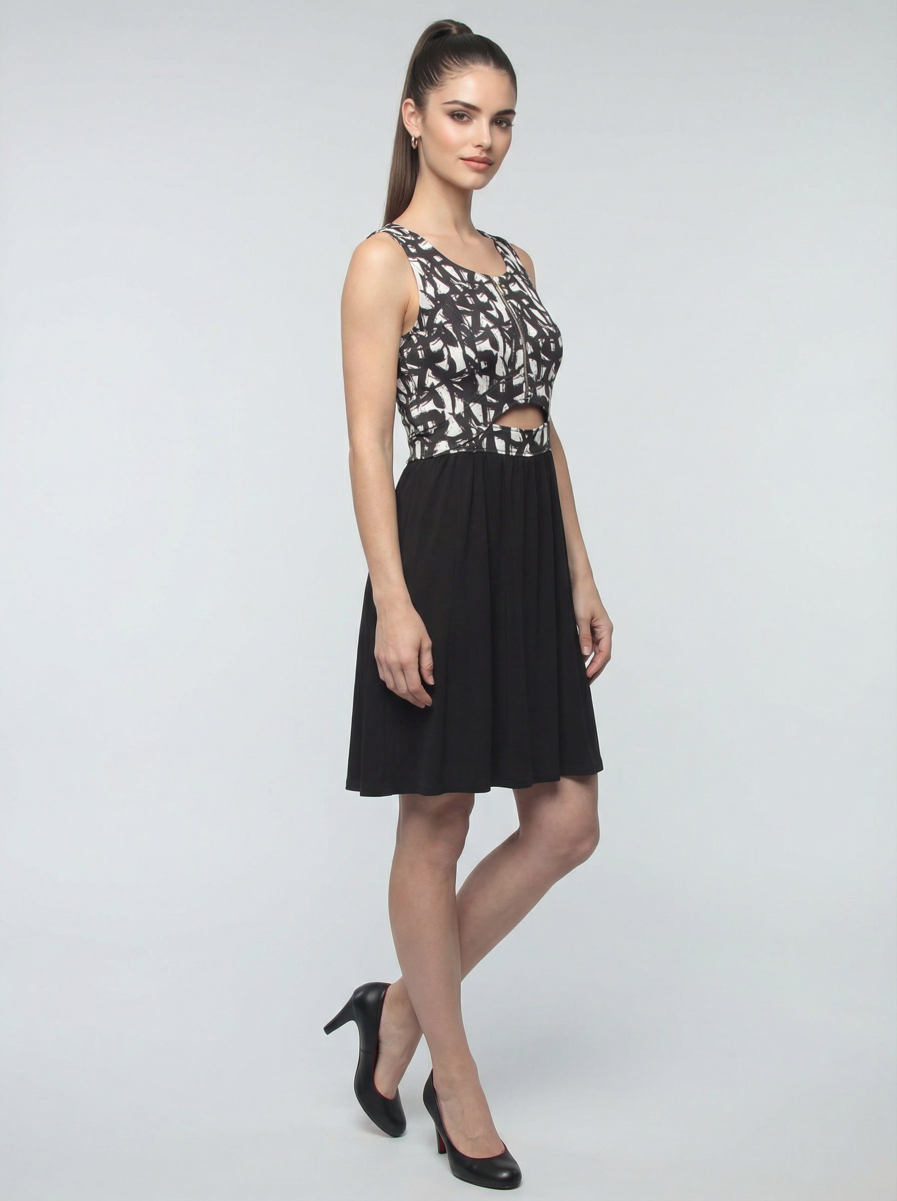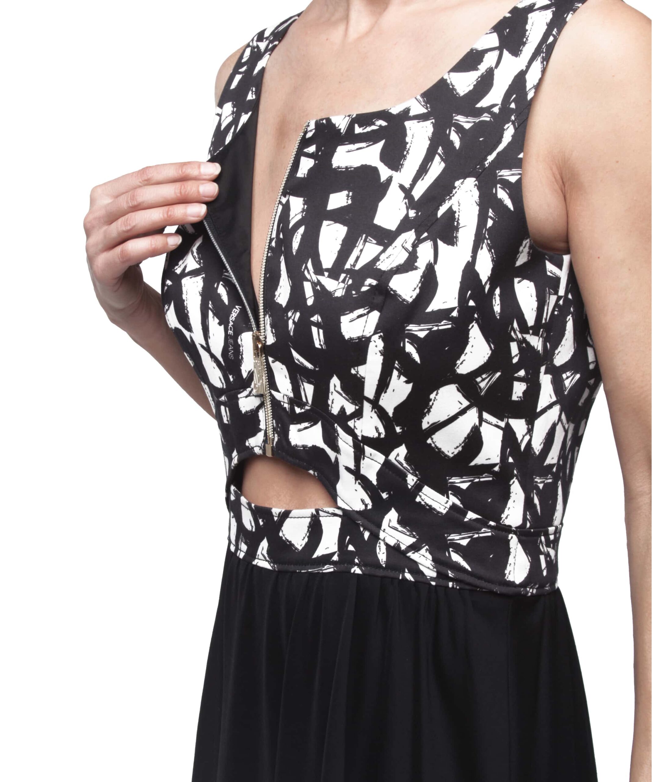 Iconic Details: Sleeveless design with a shaped neckline and a distinctive gold zip detail on the front that adds a bright spot to total black.