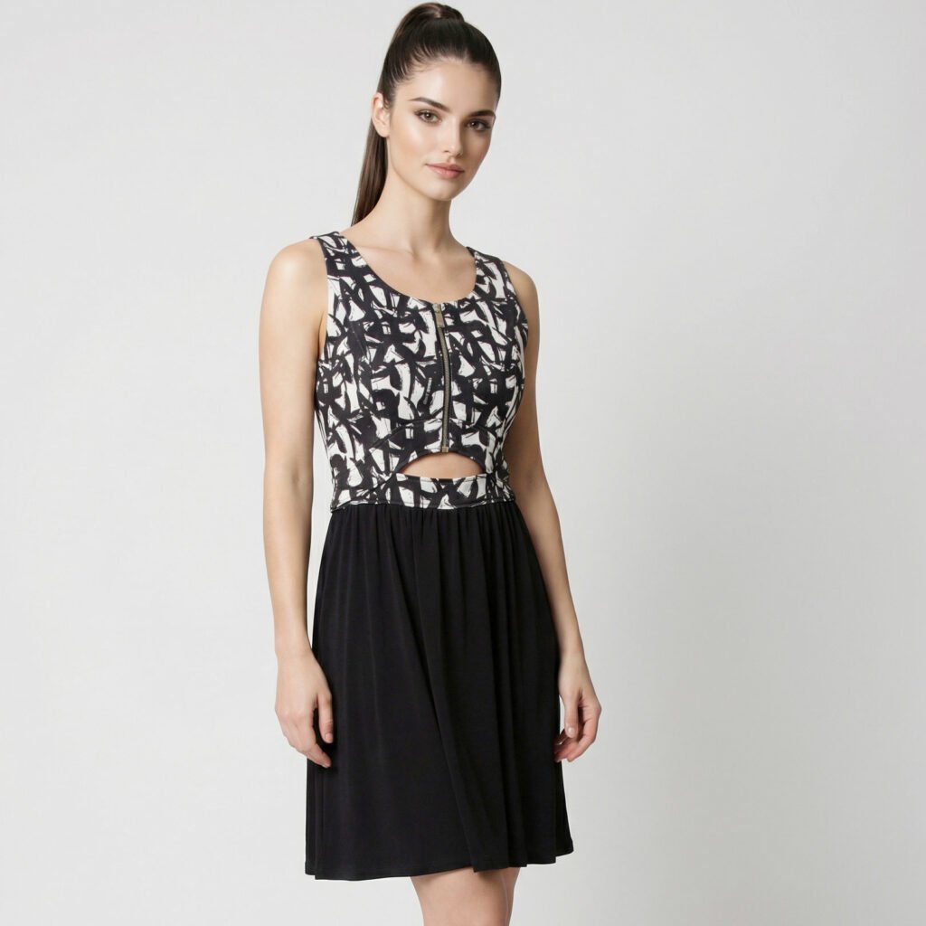 Refined and contemporary, the sleeveless black dress Versace Jeans is a versatile garment that combines the grit of metallic details with a feminine silhouette. The model is distinguished by a double front zip fastening and a back zip, offering a flared line that elegantly flatters the figure. Available in size M corresponding to the size 44 Italian