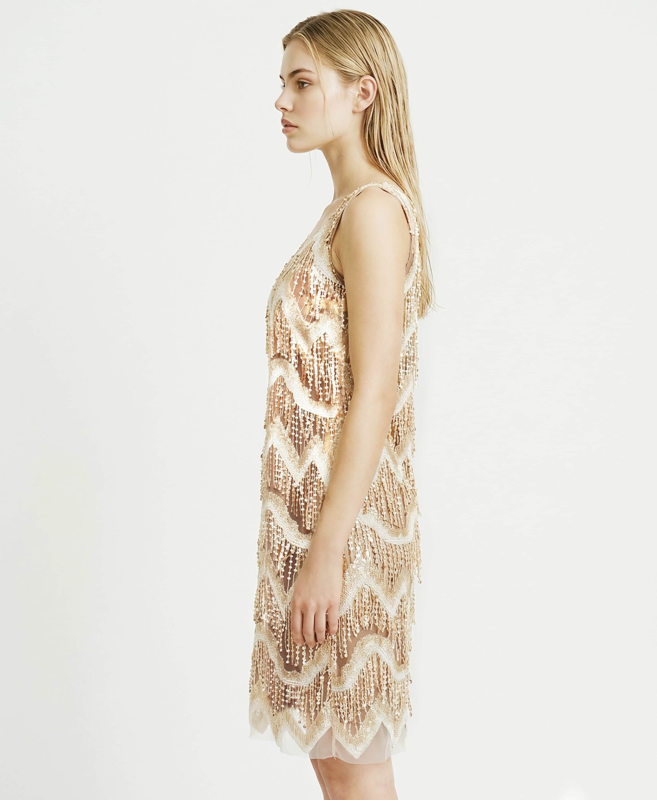 Dettagli: Ricami geometrici, paillettes, foderato, inserti in tulle