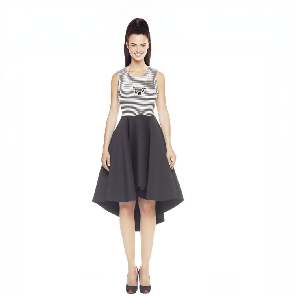 Rendi unico il tuo stile con l’abito cocktail, un sofisticato modello bicolore caratterizzato da un corpetto a righe bianco e nero e una gonna nera dal taglio asimmetrico. Completo di un prezioso accessorio collana removibile, questo dress senza maniche offre un design contemporaneo ideale per occasioni speciali.