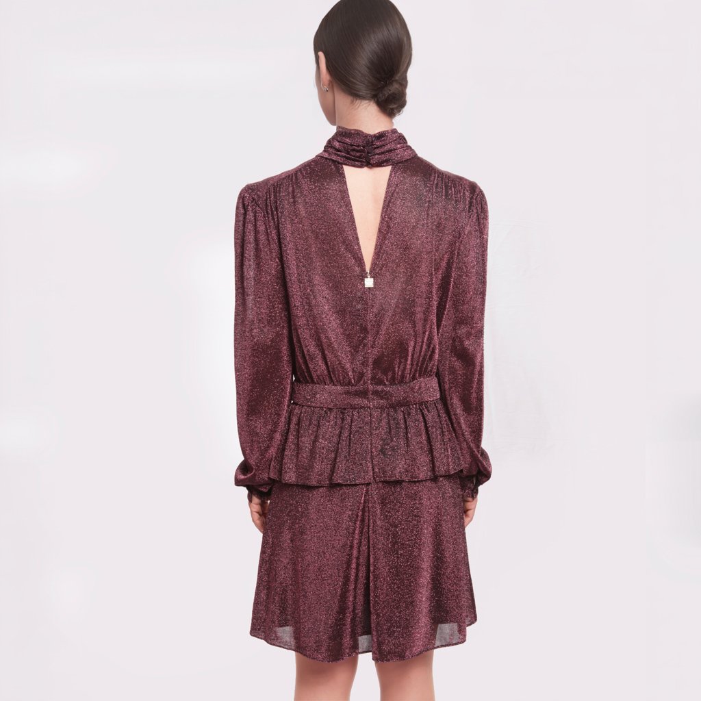 Abito corto Silvian Heach in lurex bordeaux, luminoso e elegante, con collo alto arricciato, maniche lunghe, cintura abbinata e apertura posteriore a goccia. Perfetto per serate, cocktail party ed eventi speciali.