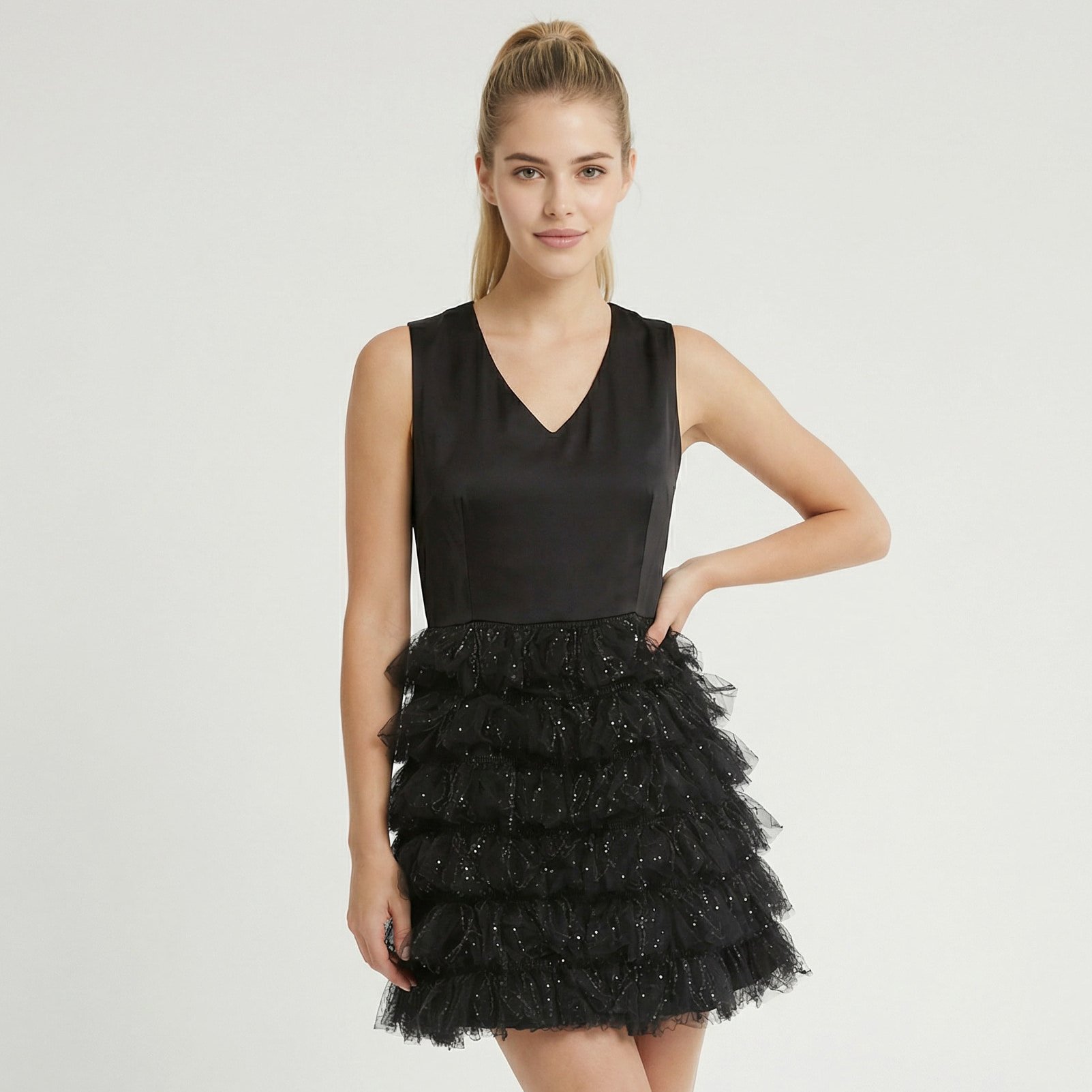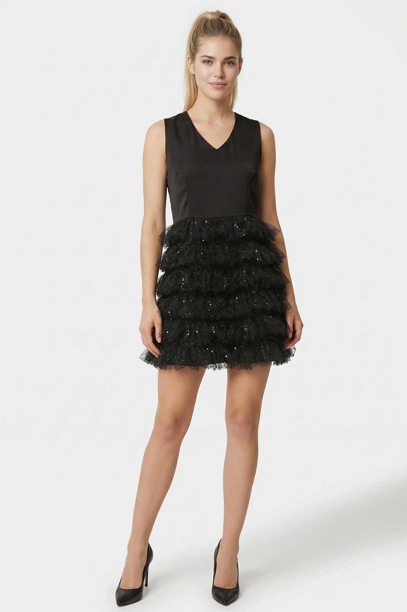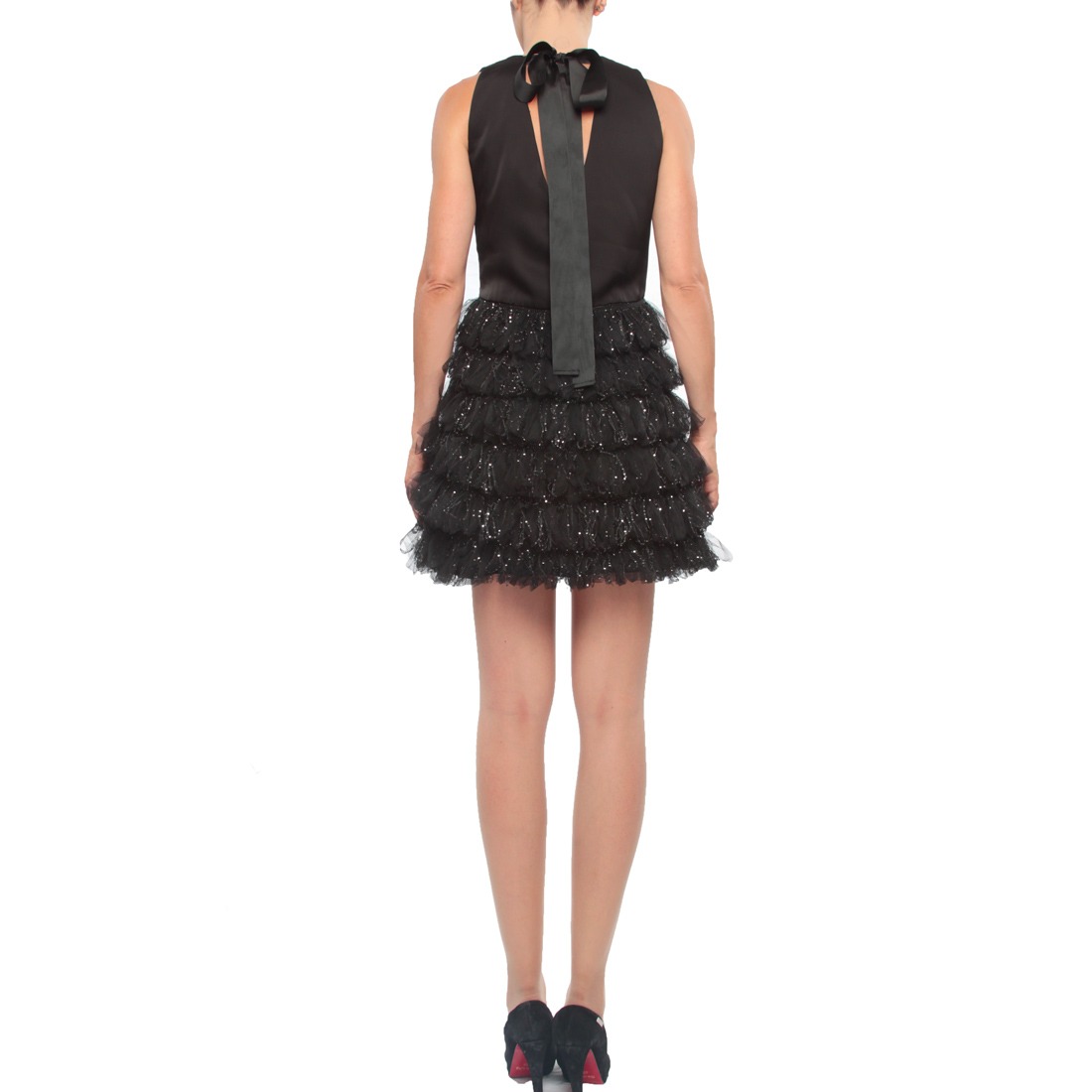 Abito corto Twinset Actitude nero donna in taglia IT 42, con balze in tulle e paillettes, corpetto in raso e linea svasata. Ideale per eventi serali.