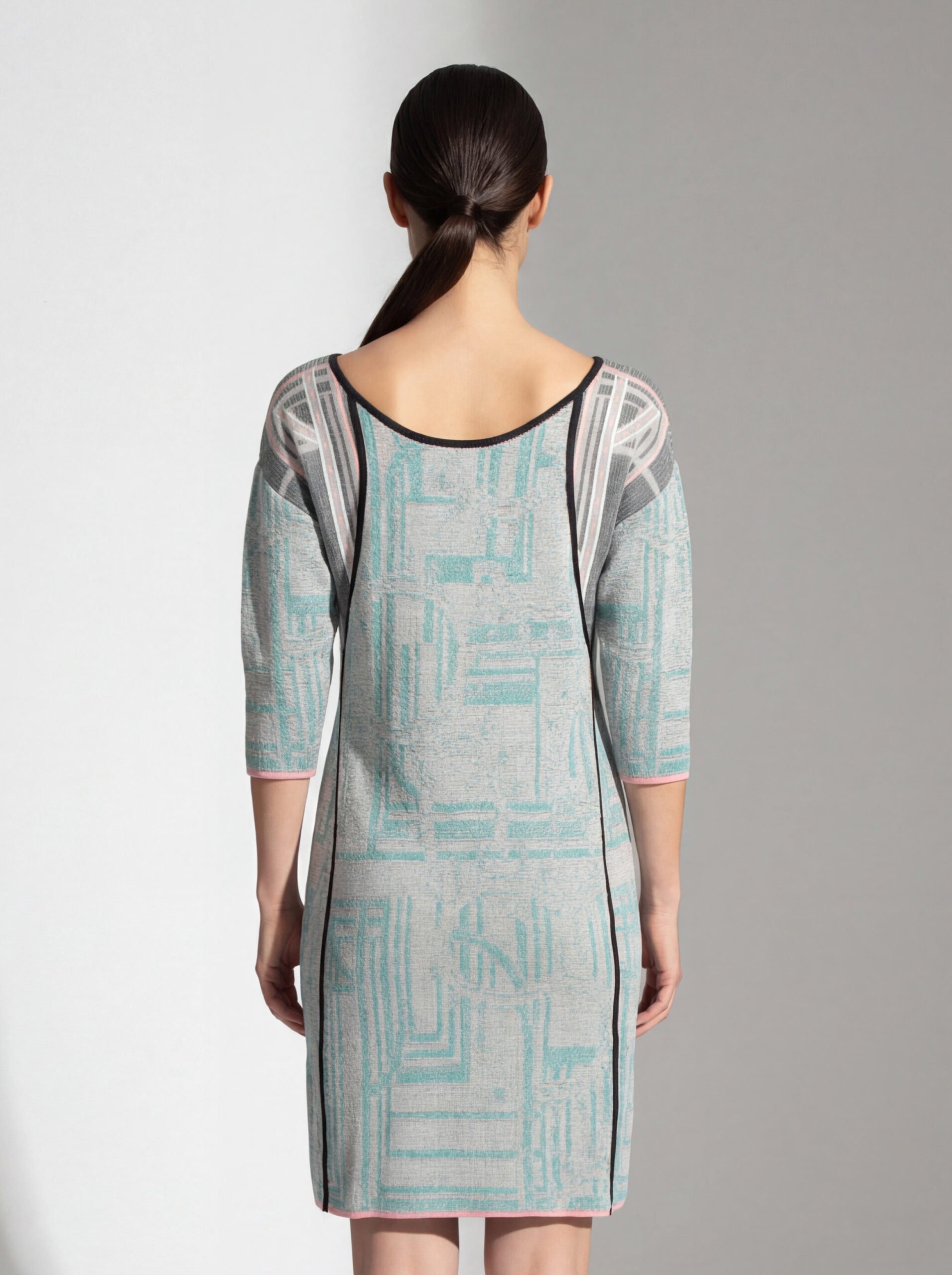 Il design presenta collo tondo, maniche 3/4 e una raffinata combinazione di colori grigio, azzurro e rosa. Un modello ideale per outfit casual chic, perfetto da abbinare a stivaletti o décolleté per un look elegante e contemporaneo.