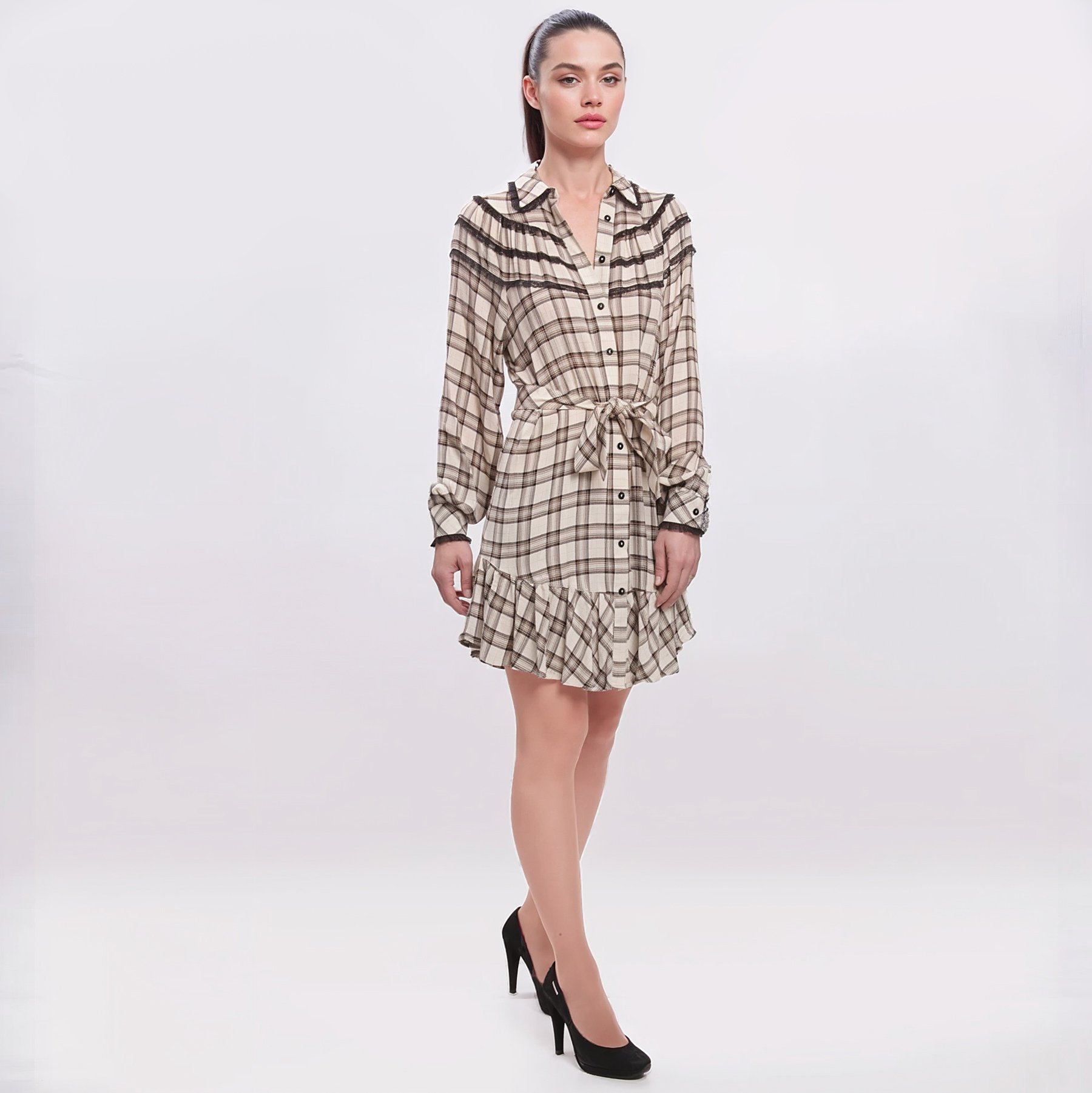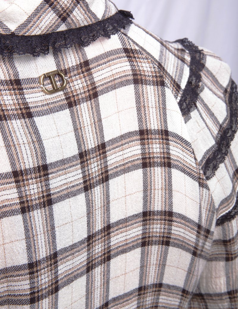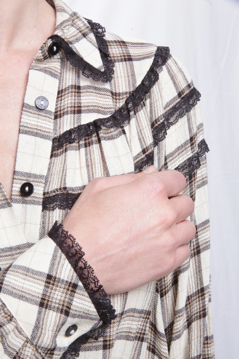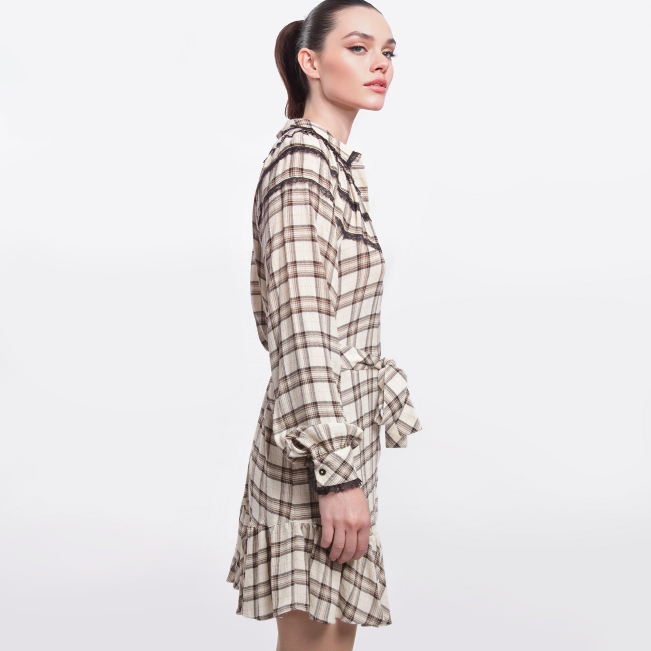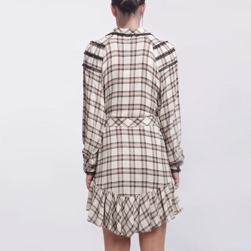 Abito corto donna Twinset con fantasia a quadri beige e marrone, maniche lunghe, chiusura a bottoni e cintura abbinata. Dettagli in pizzo nero e volant sul fondo. Perfetto per look romantici e casual chic.