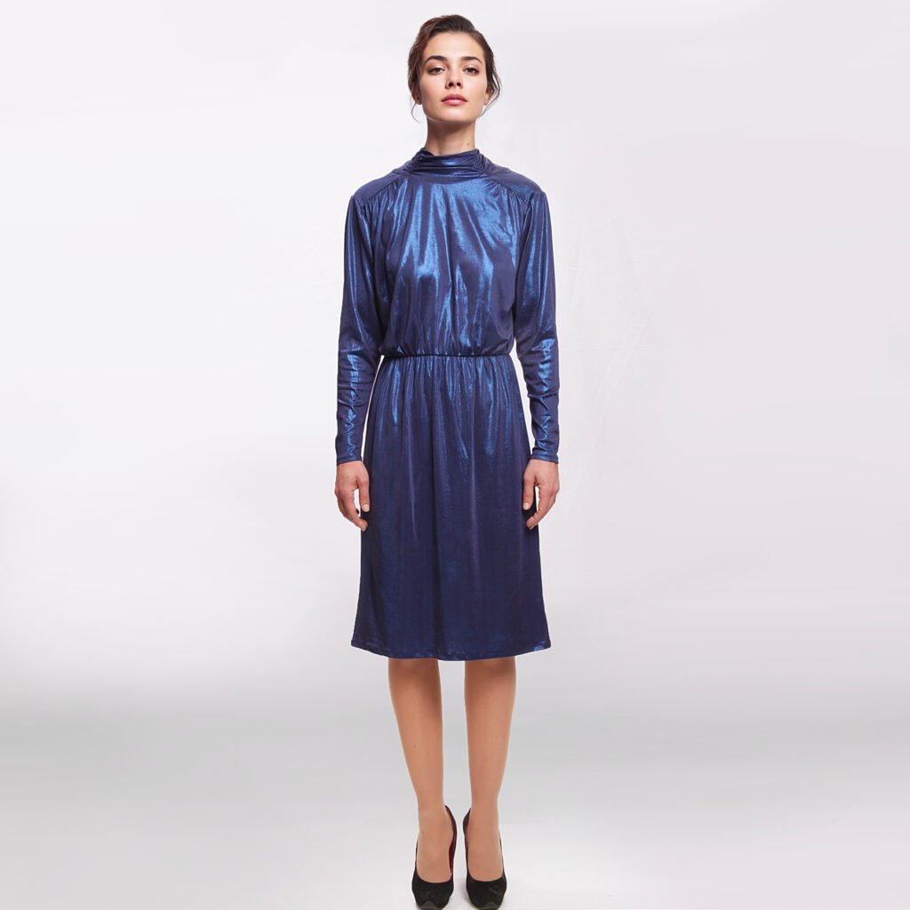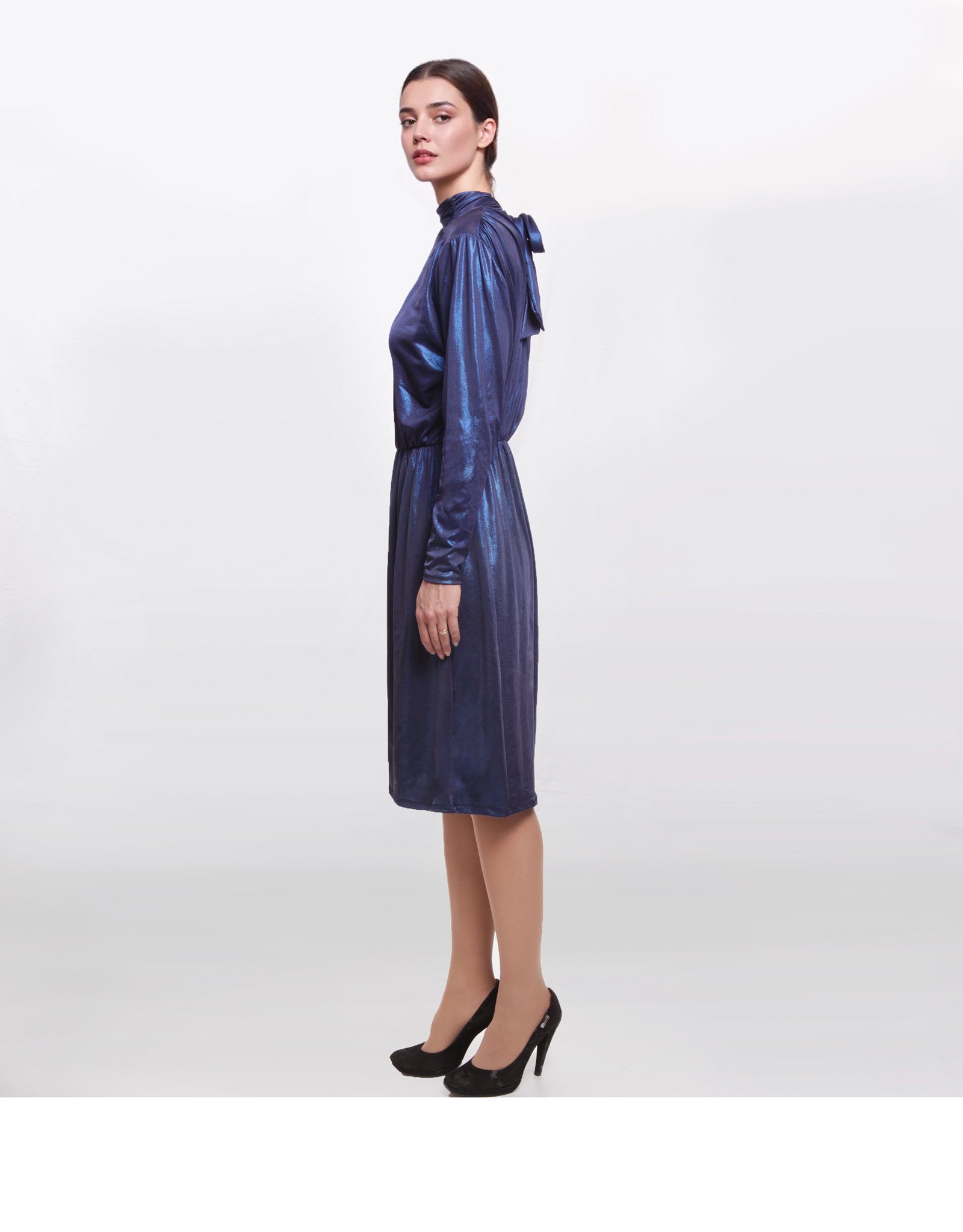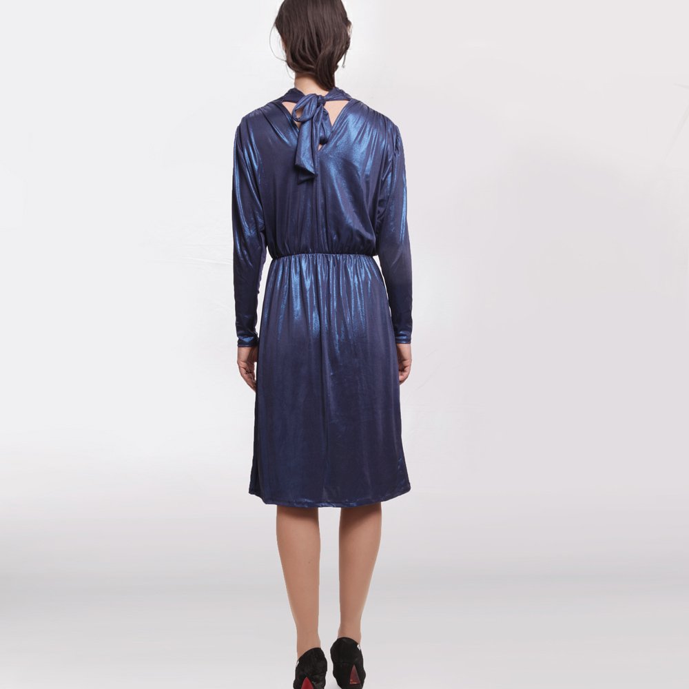 Abito elegante Kontatto blu in tessuto lucido effetto satinato, modello midi con maniche lunghe, collo alto e fiocco posteriore. Linea morbida con elastico in vita, ideale per cerimonie, eventi e look da sera raffinati.