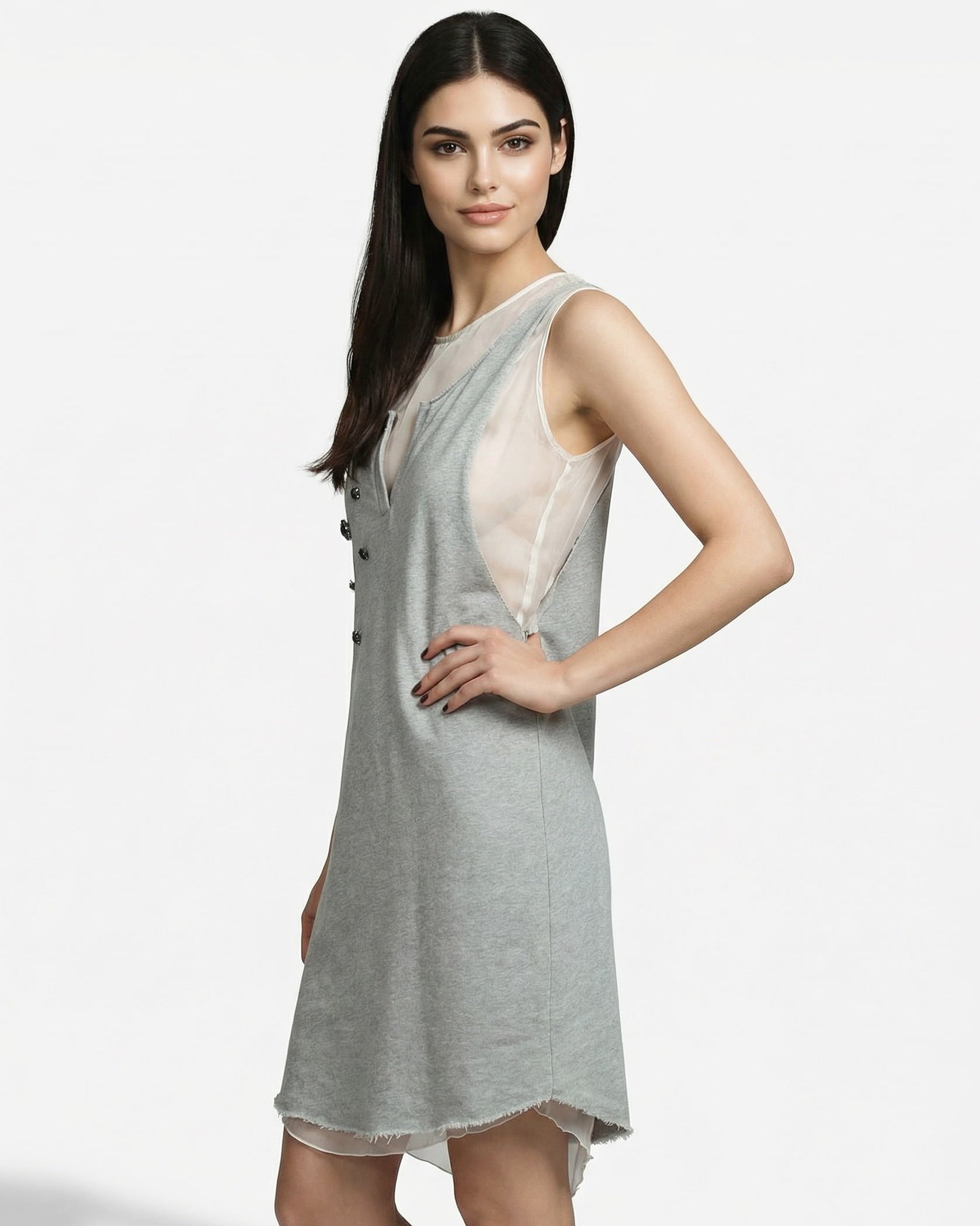 Raffinato e confortevole, l’abito JIJIL grigio è un mix perfetto di materiali nobili come il cotone e la seta. Questo modello senza maniche si distingue per il sottile inserto in seta color panna e un’esclusiva applicazione frontale di pietre gioiello, ideale per un look quotidiano ricercato o un evento informale.