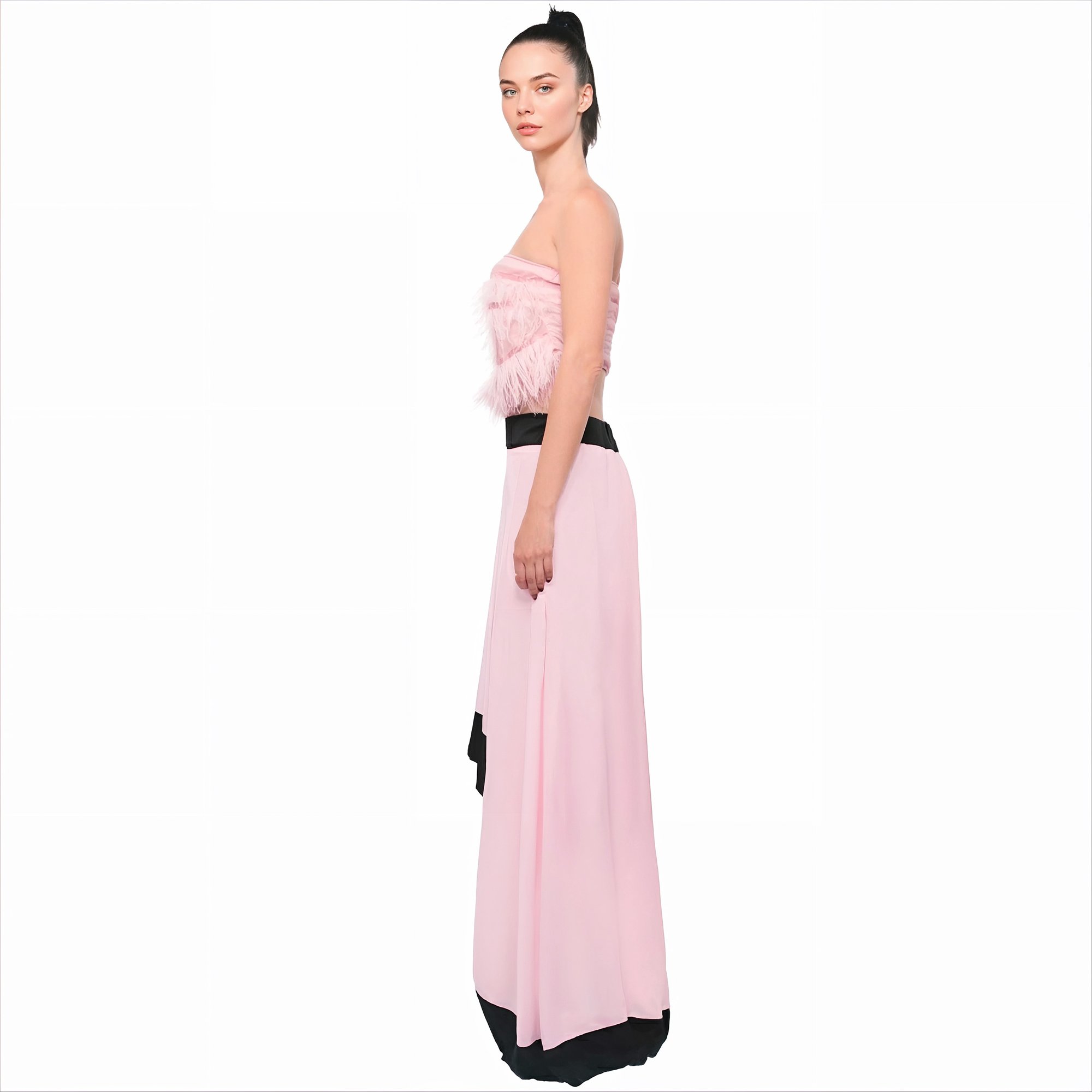L’abito asimmetrico rosa donna Annarita N è un capo elegante e scenografico, pensato per occasioni speciali e look ricercati. Il design unisce un top elasticizzato con applicazioni in piume a una gonna lunga asimmetrica, creando un equilibrio perfetto tra femminilità e stile contemporaneo.