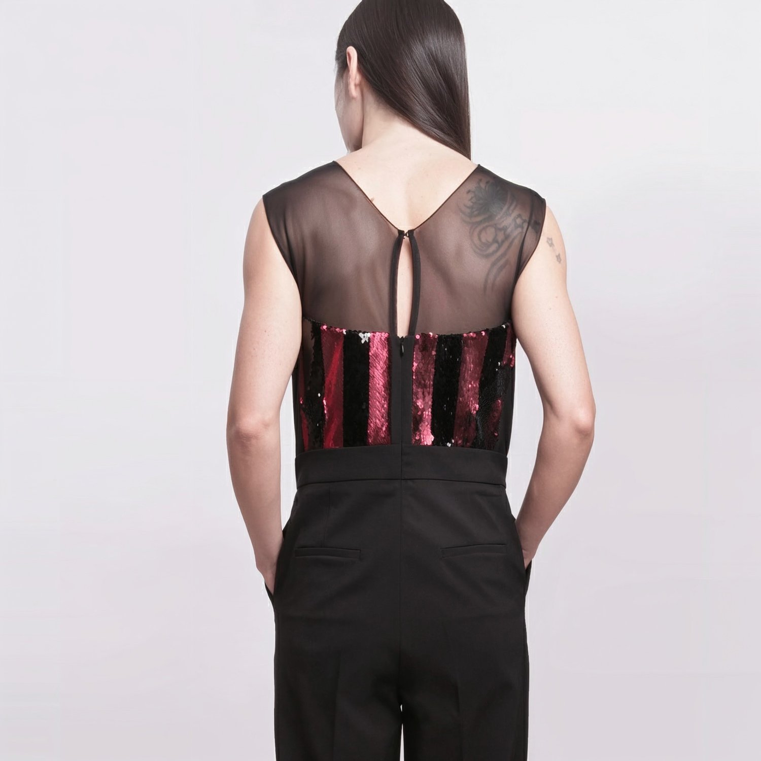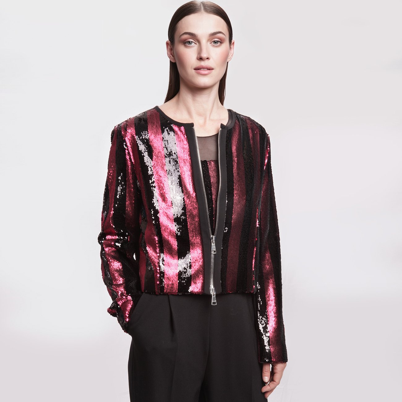 Top Luminoso: Decorato con paillettes verticali rosa, fucsia e nere su base trasparente per un effetto di grande luminosità.