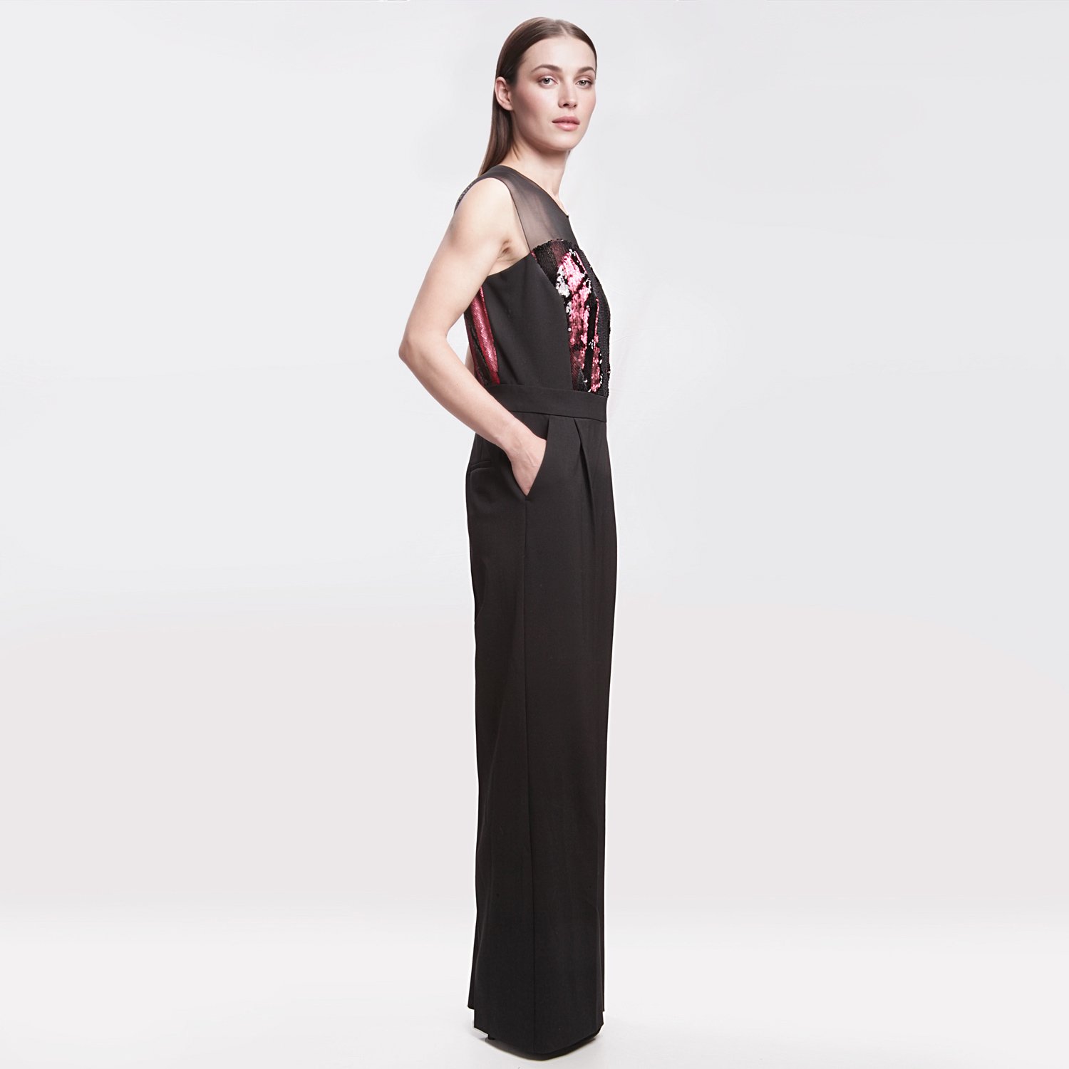 Sofisticata tuta intera Beatrice B da donna, un capo moderno che unisce luminosità e comfort. Il modello si distingue per il top senza maniche decorato con paillettes verticali nei toni del rosa, fucsia e nero, abbinato a eleganti pantaloni a palazzo in tessuto fluido nero. Disponibile in taglia M corrispondente alla taglia 44 italiana,