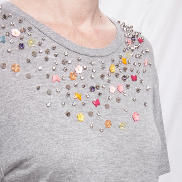 T shirt donna Blugirl in cotone grigio perla con applicazioni floreali e borchie sul girocollo. Modello femminile, morbido e Made in Italy.