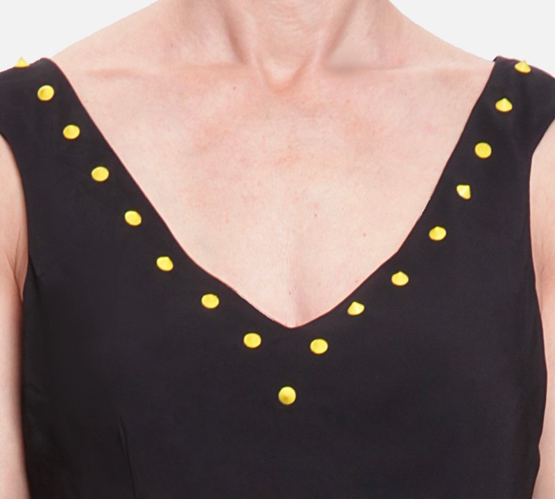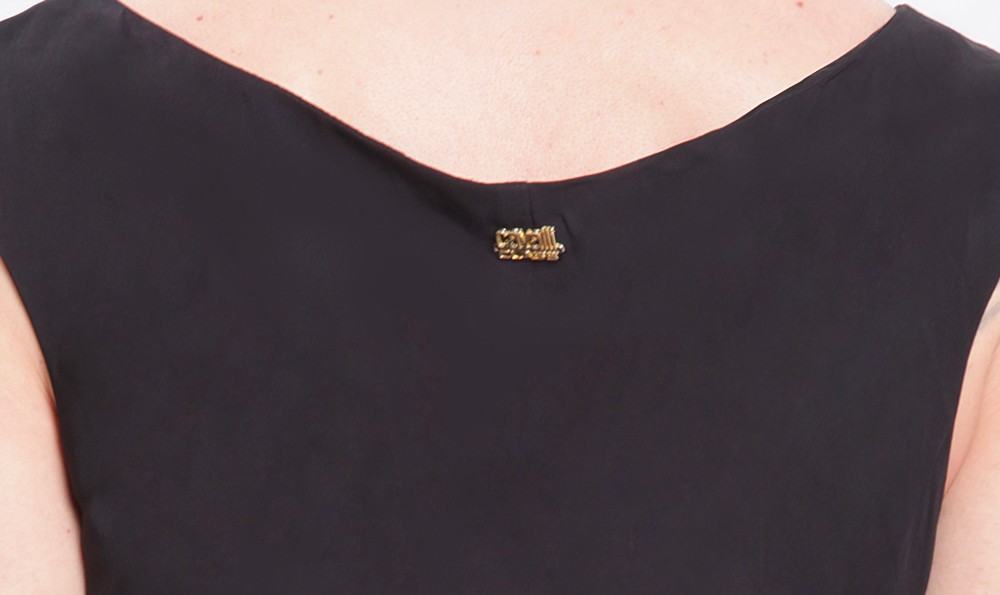 Il top Cavalli Class modello D3IVA670 è un concentrato di stile audace e sartorialità. Questo top smanicato nero si distingue per lo scollo a “V” profondamente rifinito da una serie di borchie gialle in plastica dura che illuminano il volto e conferiscono un carattere grintoso e moderno al capo. La parte posteriore presenta uno scollo a “U” più discreto, impreziosito dal logo metallico dorato Cavalli Class applicato centralmente.