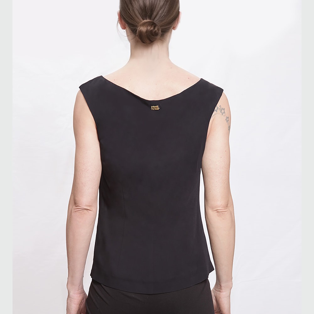 Top smanicato Cavalli Class modello D3IVA670 in pregiata viscosa nera elasticizzata. Caratterizzato da un audace scollo a V con borchie gialle a contrasto e logo metallico dorato sul retro, offre una vestibilità impeccabile grazie alla pratica zip laterale sinistra. Un capo iconico e grintoso, perfetto per elevare ogni outfit serale in taglia 40.