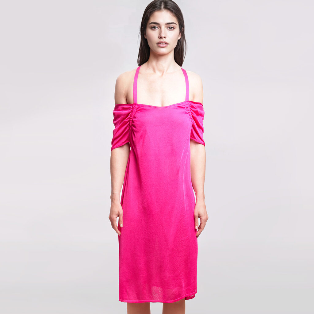 Accendi la tua serata con un’esplosione di pura energia. Questo abito non è solo un capo d’abbigliamento, ma una promessa di stile: la sua tonalità fucsia vibrante cattura ogni sguardo, mentre il gioco di spalline a incrocio e il taglio midi regalano un’eleganza fluida e magnetica. Pensato per chi ama brillare, trasforma ogni occasione in un momento di carattere indimenticabile.