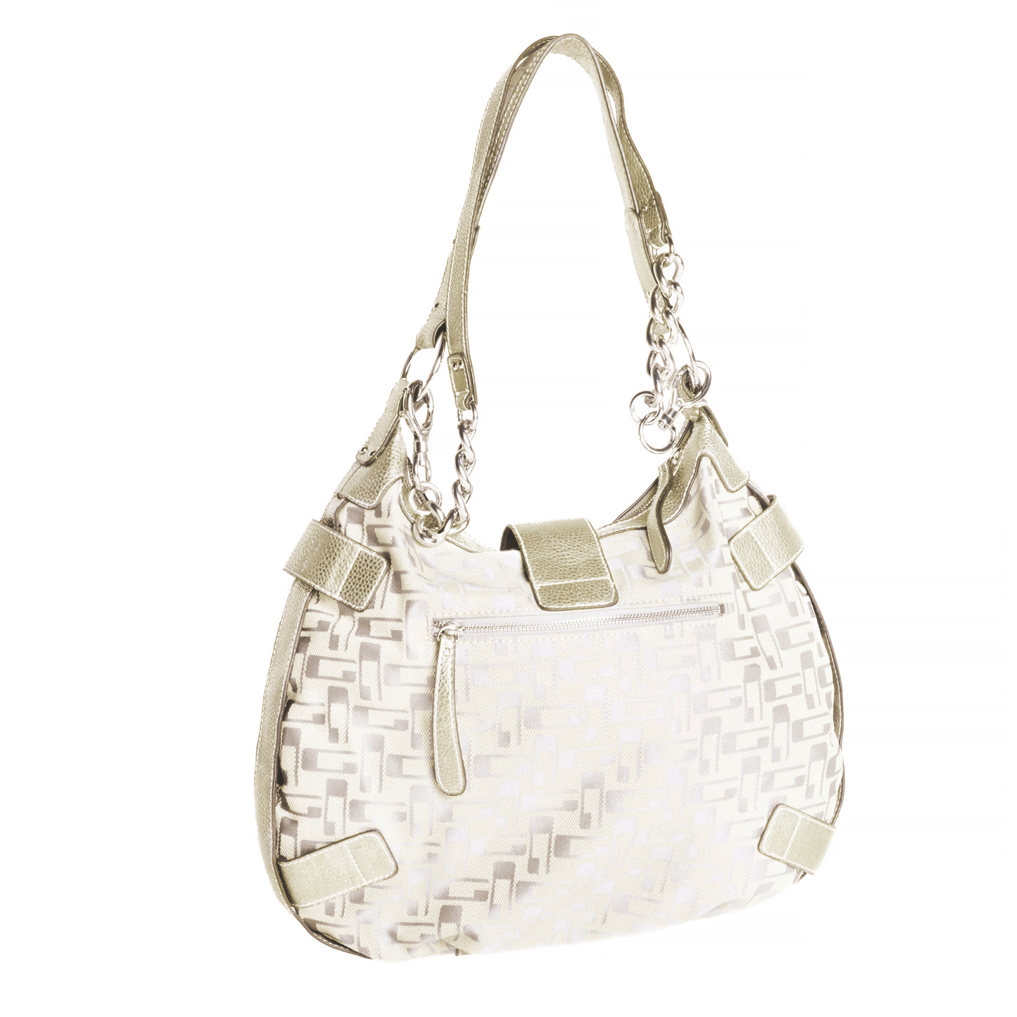 Realizzata in tessuto jacquard con motivo logato e inserti in ecopelle color oro, questa borsa unisce raffinatezza e funzionalità, rendendola perfetta sia per il giorno che per la sera.