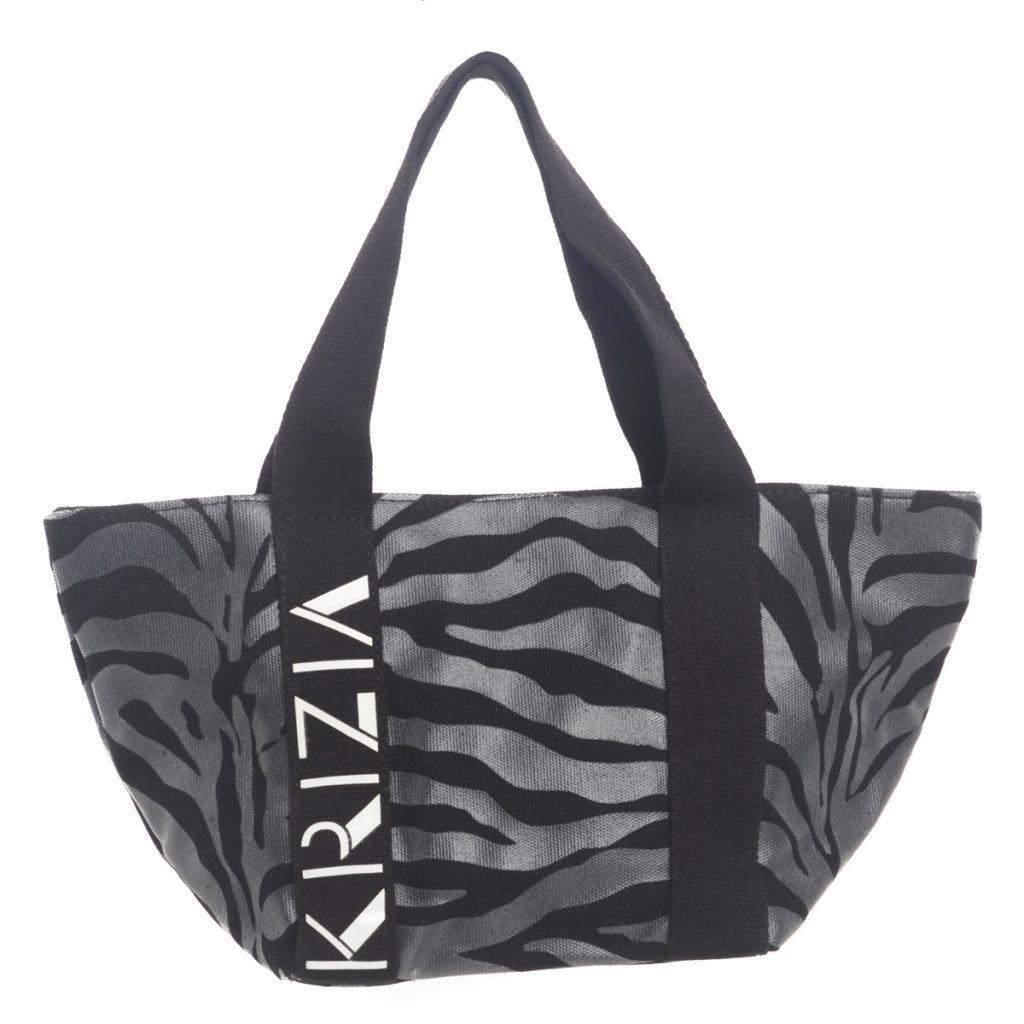 Shopper KRIZIA da donna nera in tela con fantasia zebrata, chiusura zip e struttura morbida. Pratica e riconoscibile.