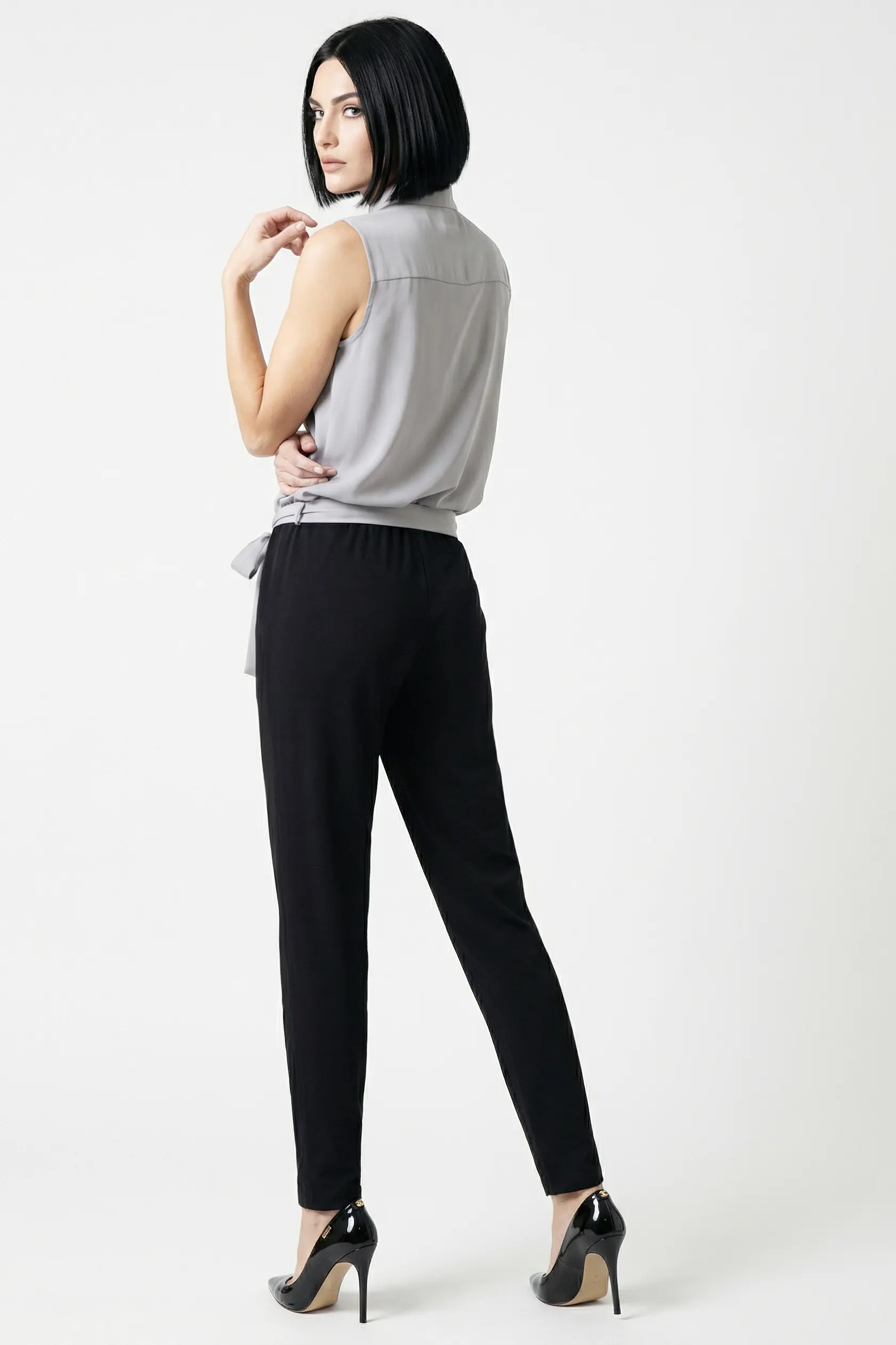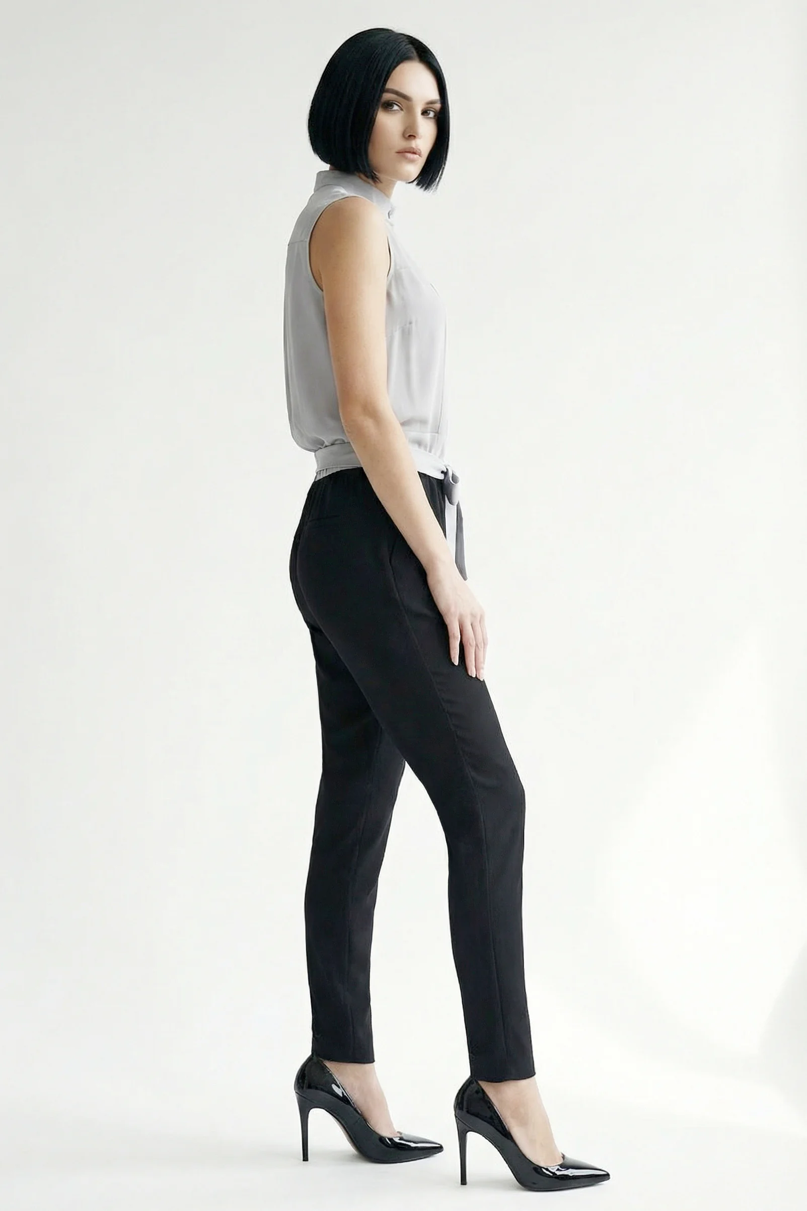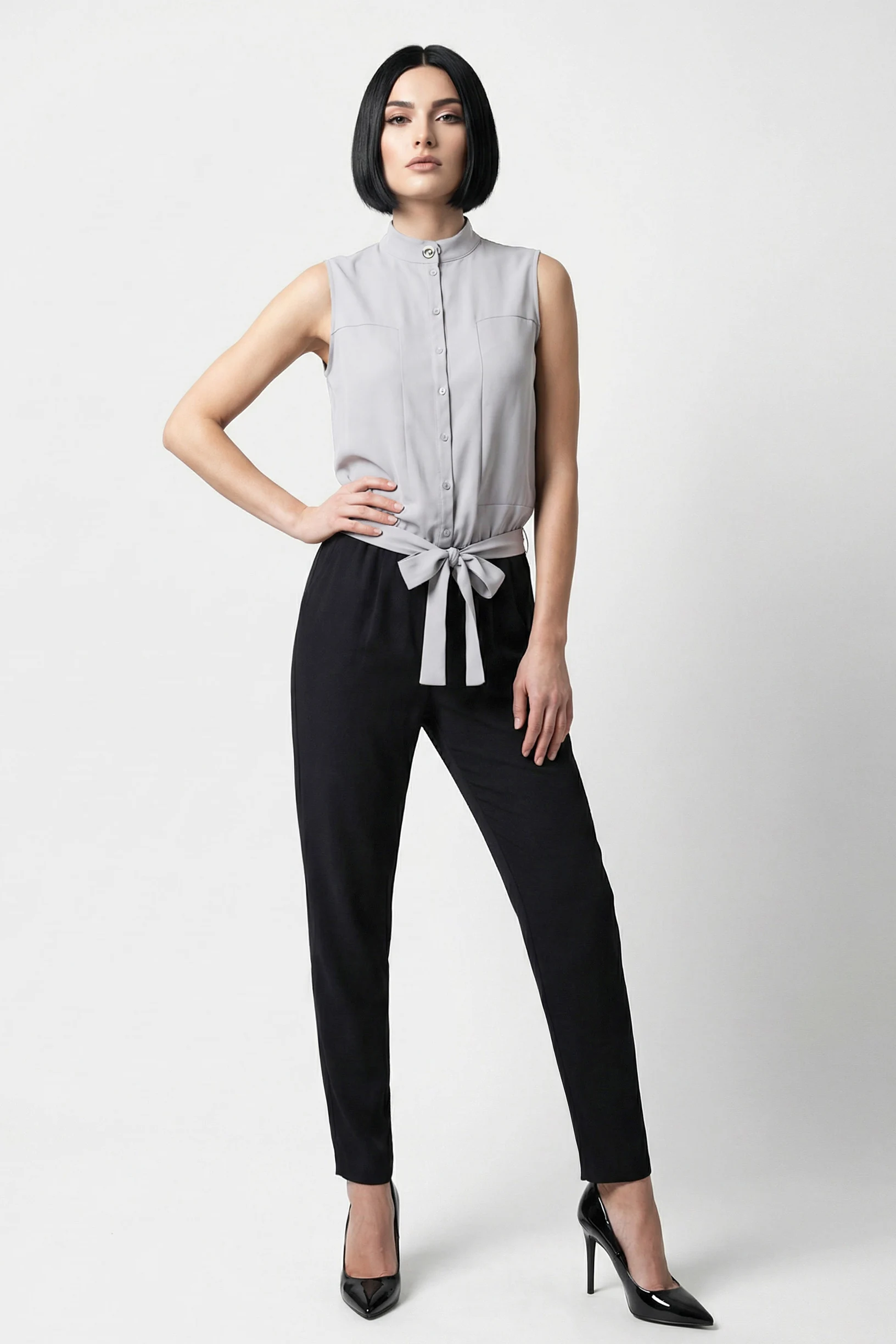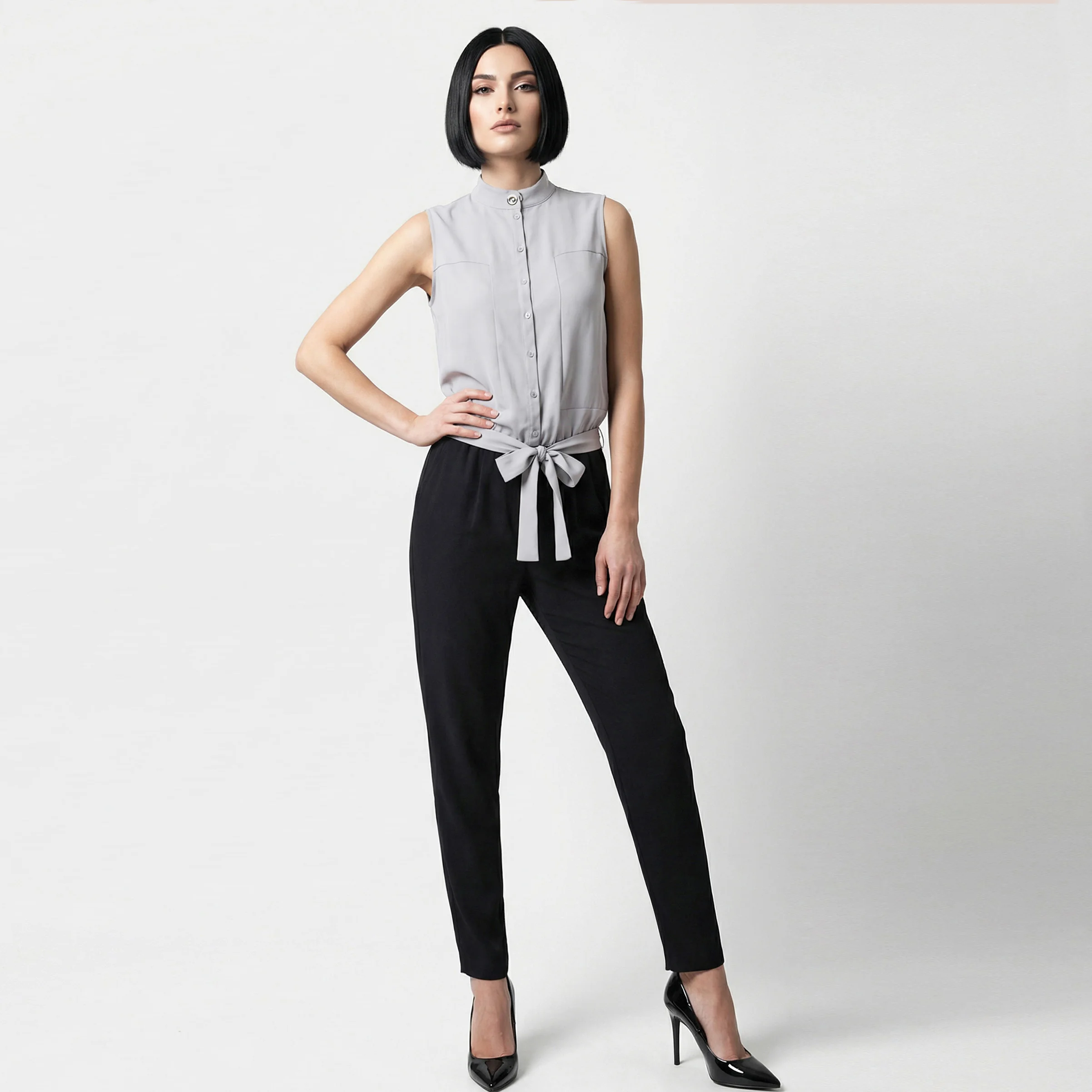 Il modello senza maniche è completato da bottoni frontali e cintura in vita che definisce la figura. Le tasche laterali aggiungono funzionalità, mentre la vestibilità normale assicura comfort durante tutta la giornata. Una tuta donna elegante perfetta per ufficio, eventi o occasioni speciali.