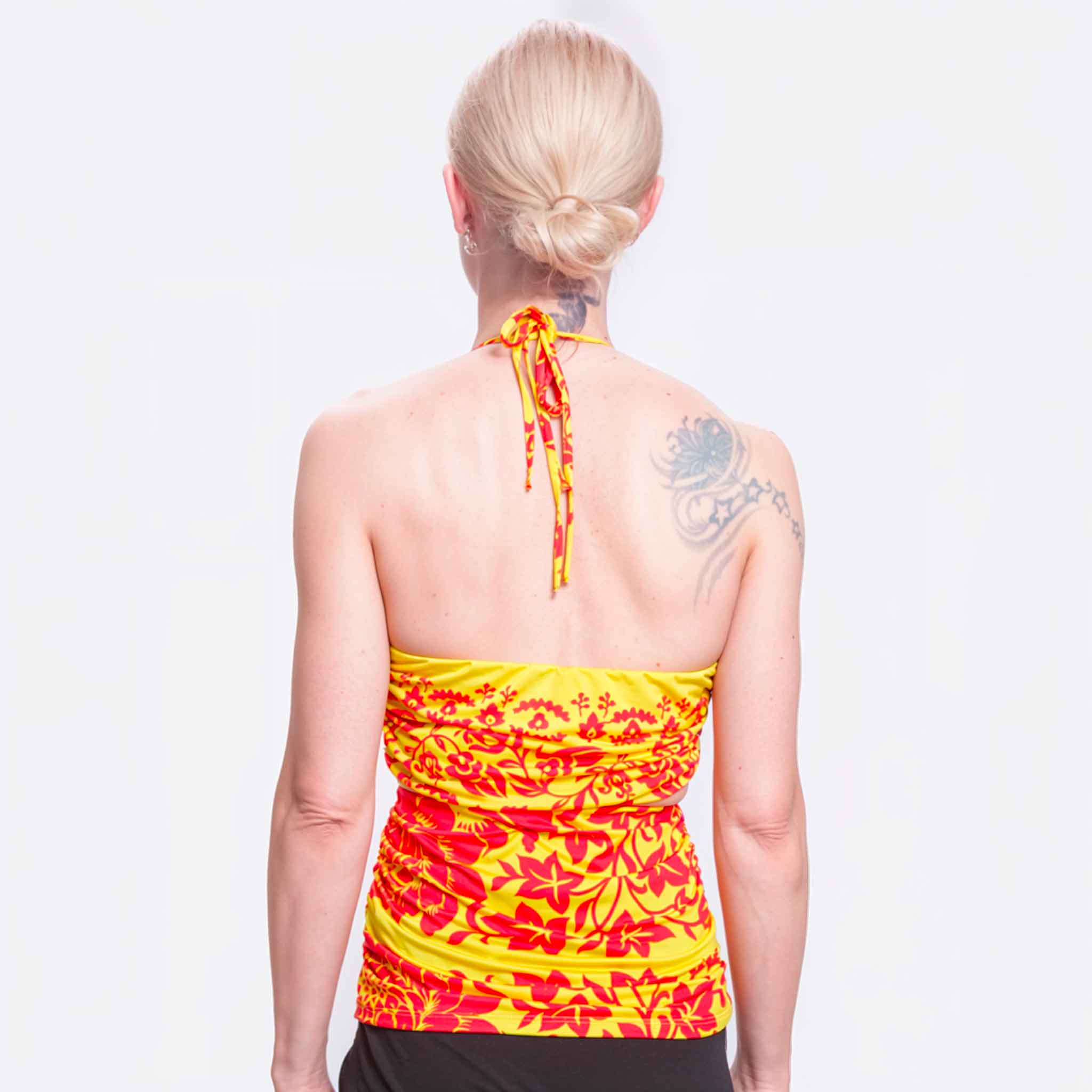 Design: Allaccio al collo (halter) con struttura a due pezzi uniti frontalmente.