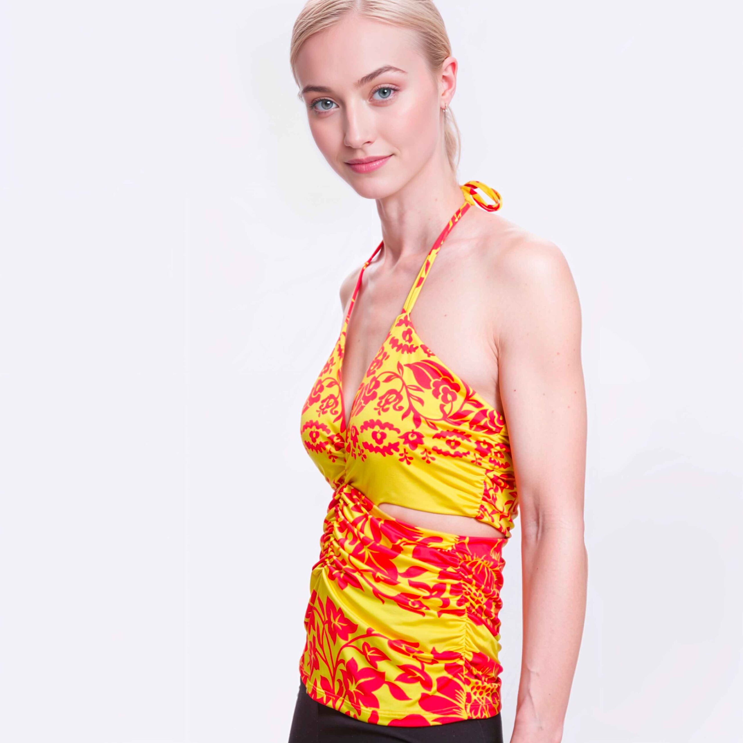 Questo top firmato Beatrice B è un esempio perfetto di come la sartoria italiana possa reinventare i capi classici. La stampa floreale rossa su fondo giallo/arancio emana calore e vitalità, rendendolo il capo ideale per brillare durante la bella stagione.