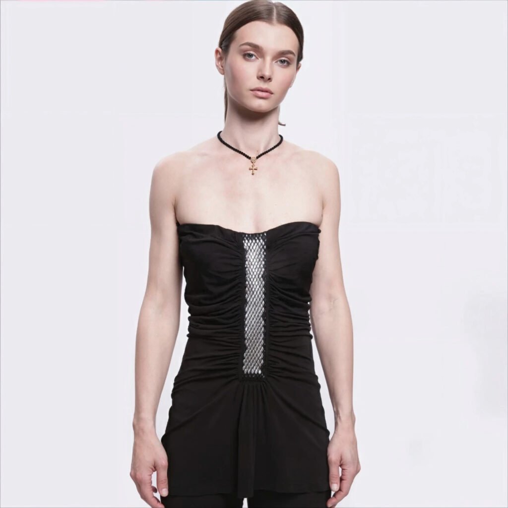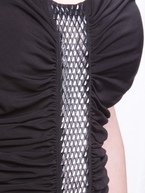 Il design presenta un inserto gioiello argentato al centro, un dettaglio luminoso che aggiunge carattere e raffinatezza. Le arricciature frontali donano un effetto snellente e rendono questo top perfetto per look da sera, eventi speciali o outfit eleganti.