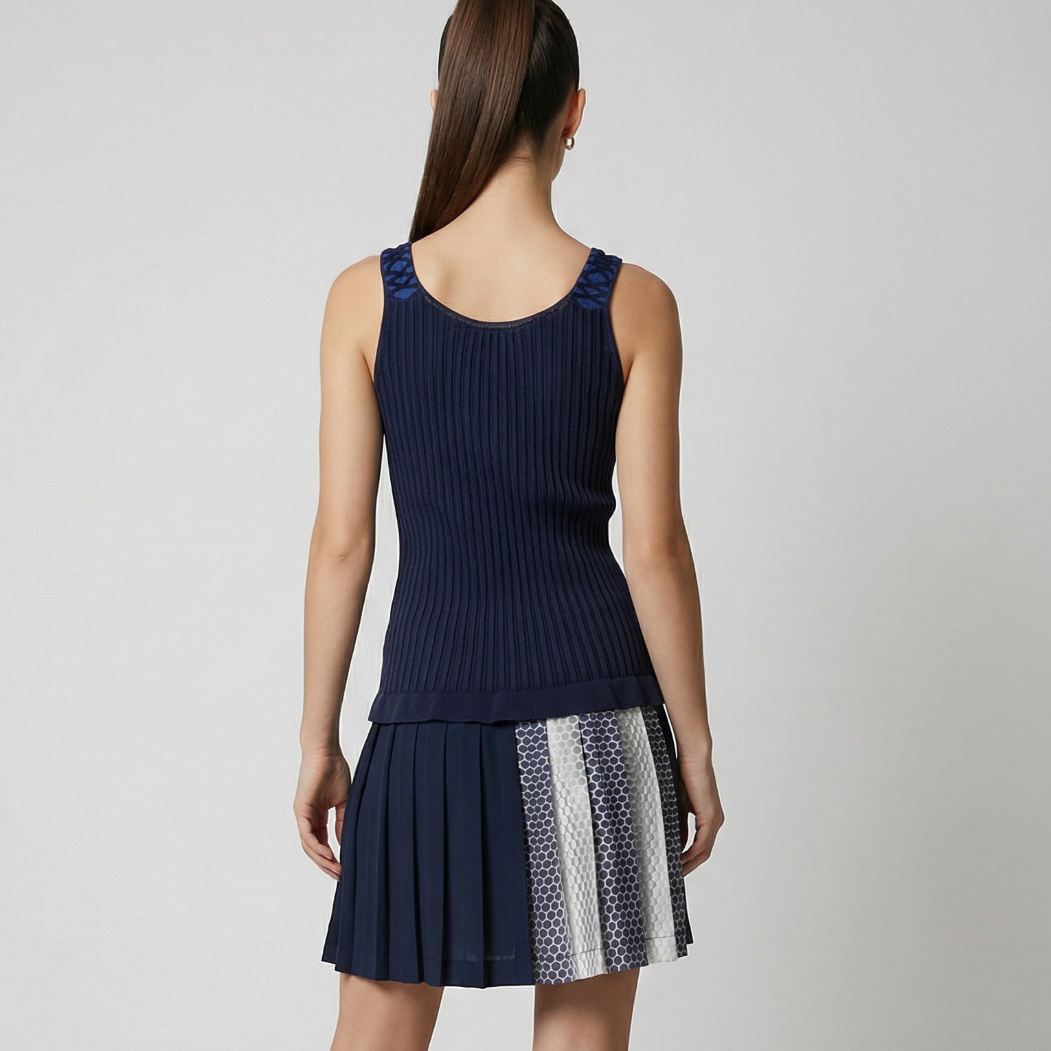 Corpetto a Coste: La lavorazione a coste blu scuro definisce la silhouette con una linea dritta che si adatta con naturalezza alle curve.