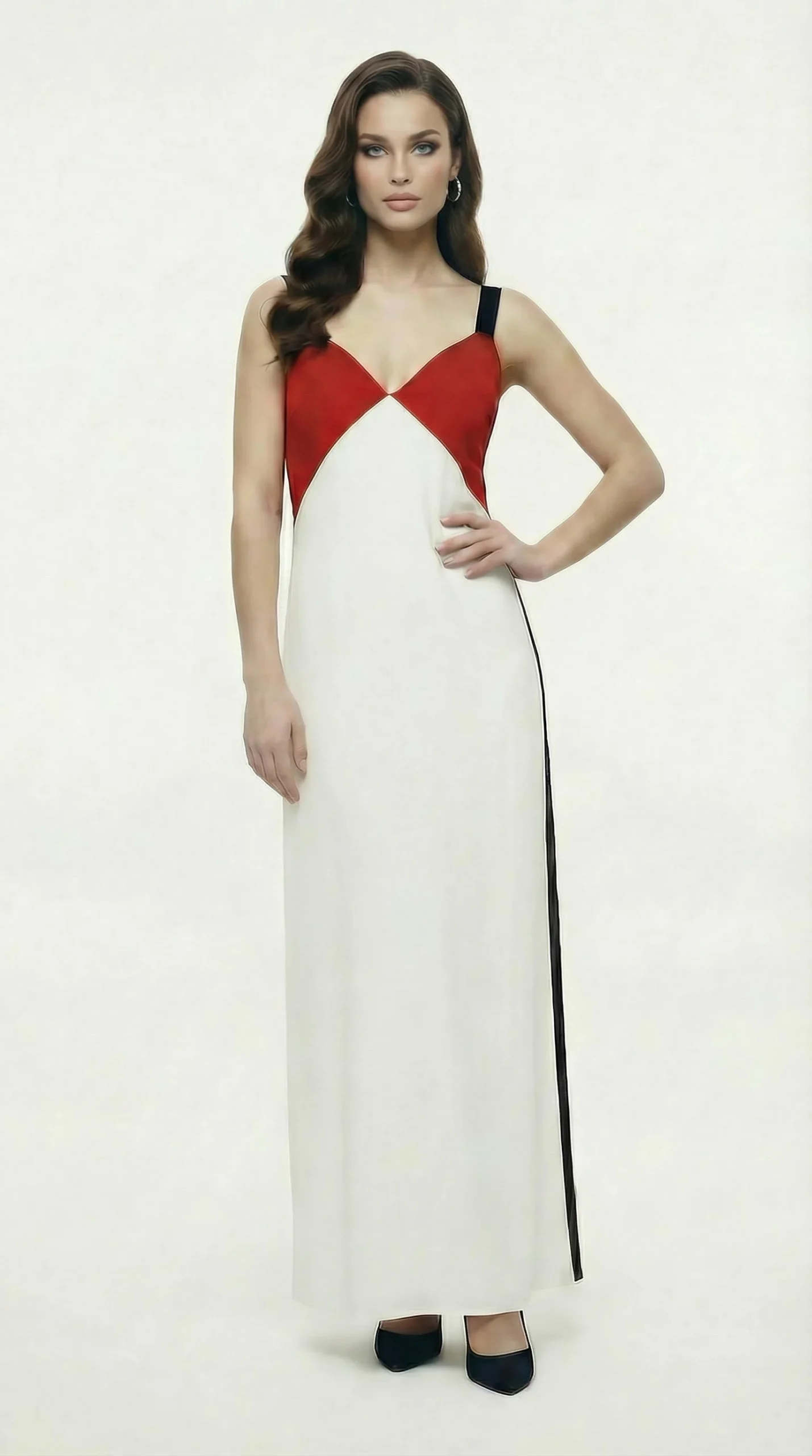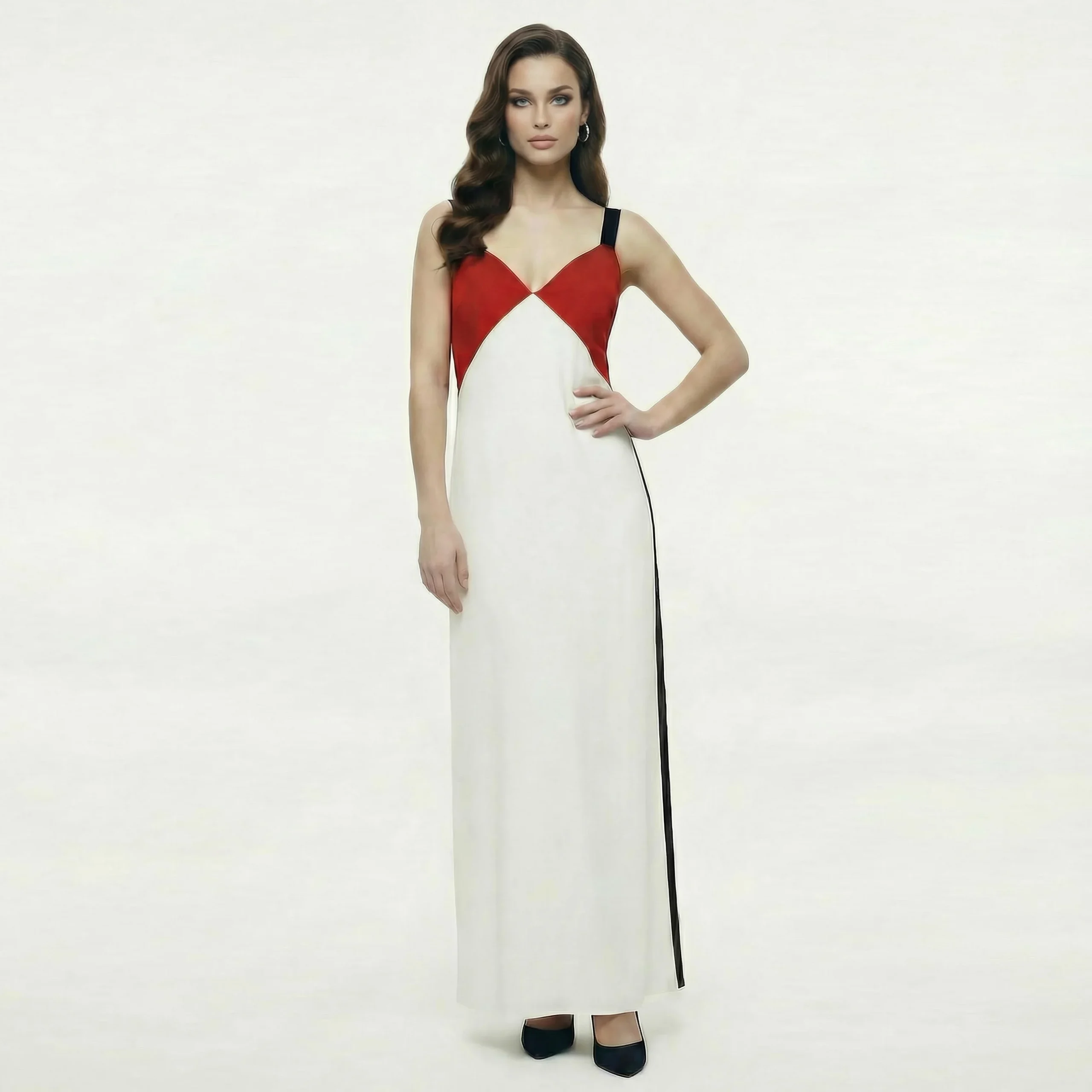 Fresco e dinamico vestito lungo estivo Twenty Easy by Kaos, caratterizzato da un elegante design tricolore in bianco, rosso e nero. Il modello presenta un raffinato scollo a V, spalline larghe nere a contrasto e profondi spacchi laterali che donano movimento alla silhouette. Realizzato in tessuto fluido, offre una vestibilità morbida in taglia S corrispondente alla taglia 42 italiana.