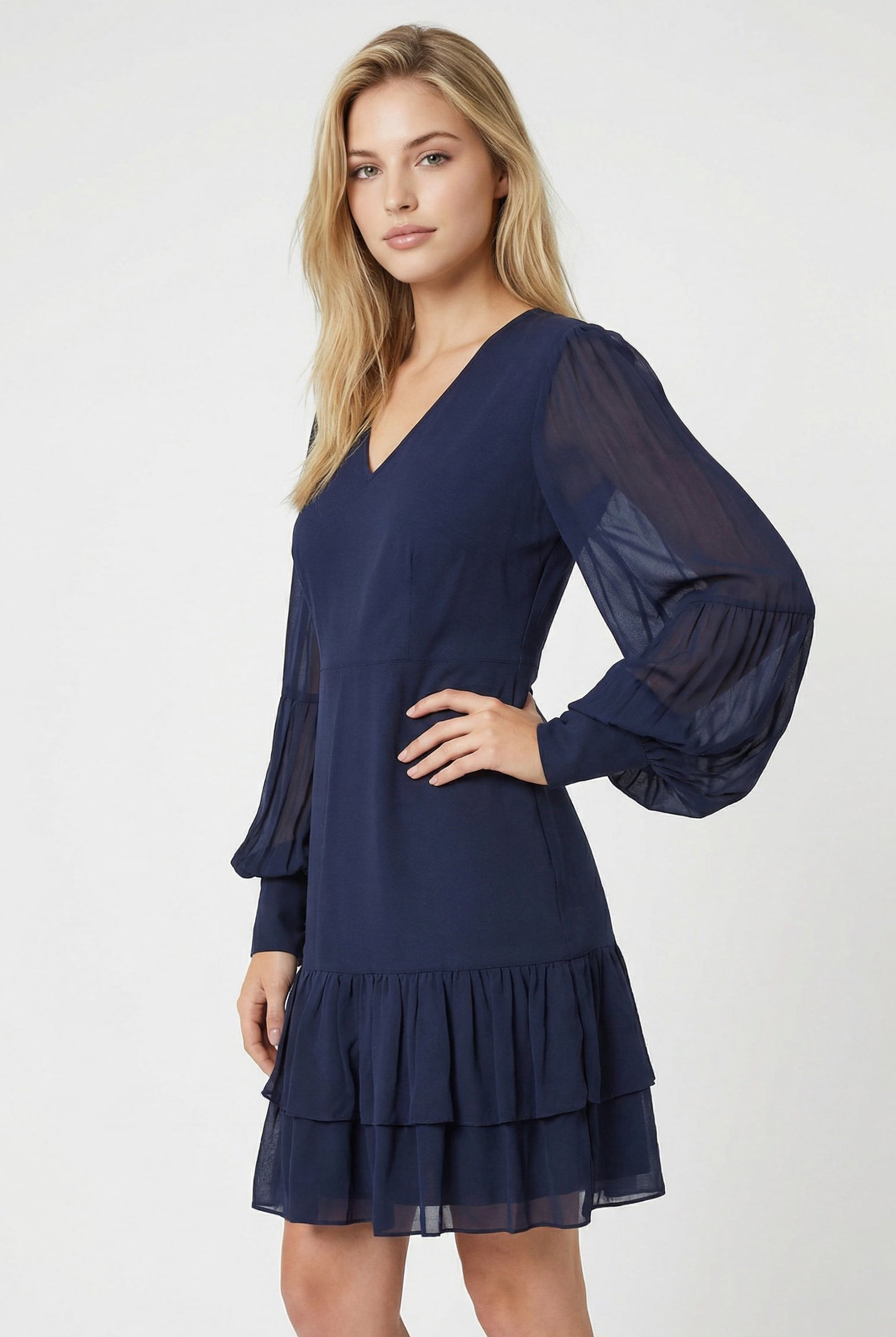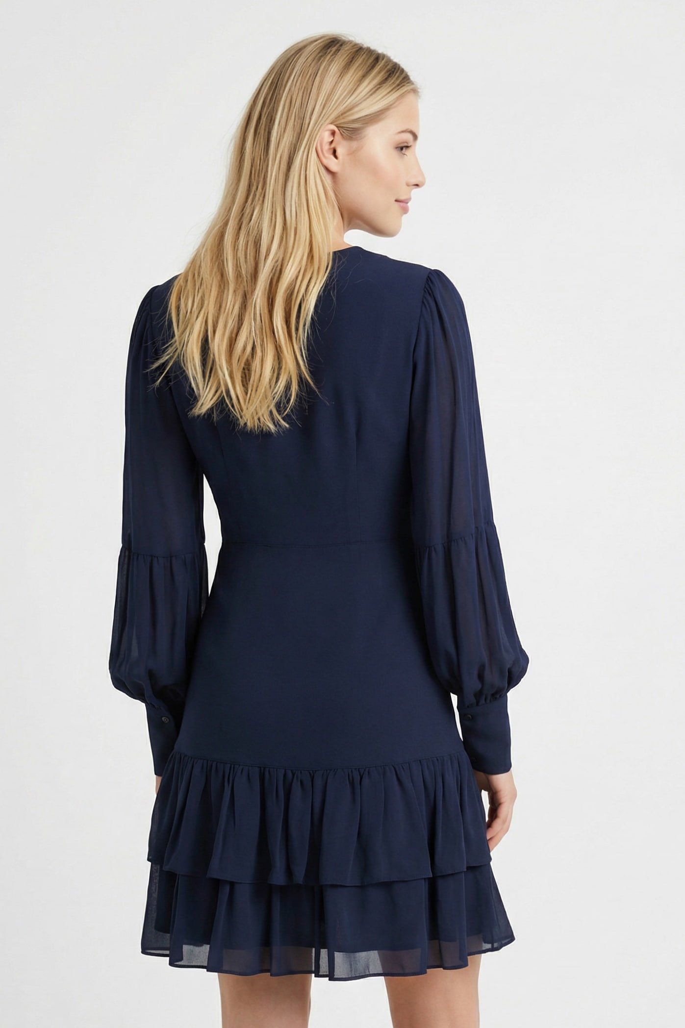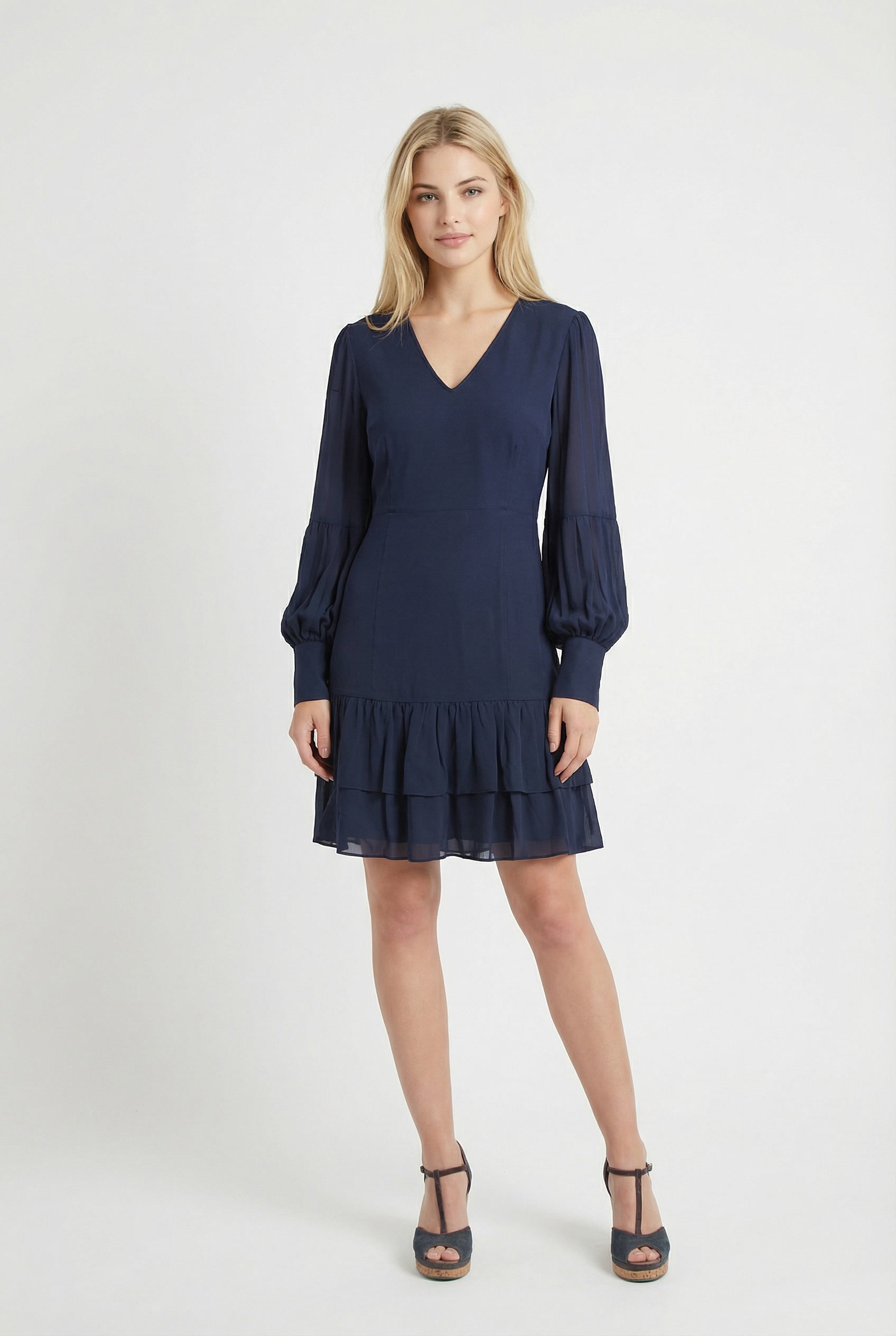 Abito corto punto Milano Twinset blu Midnight con linea svasata, scollo a V e balze in georgette trasparente. Elegante, romantico e confortevole.