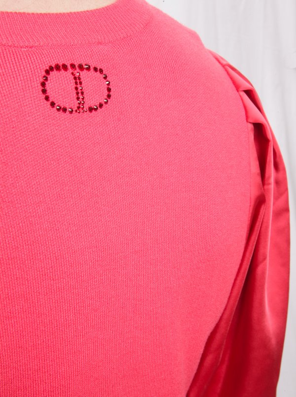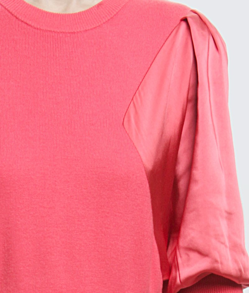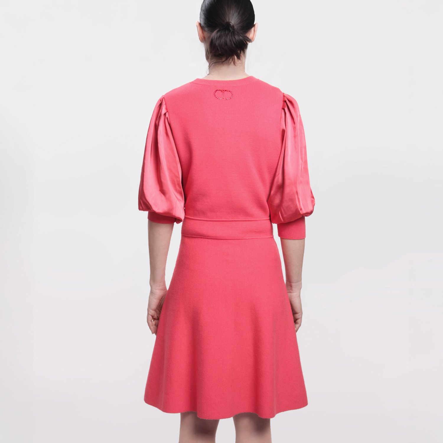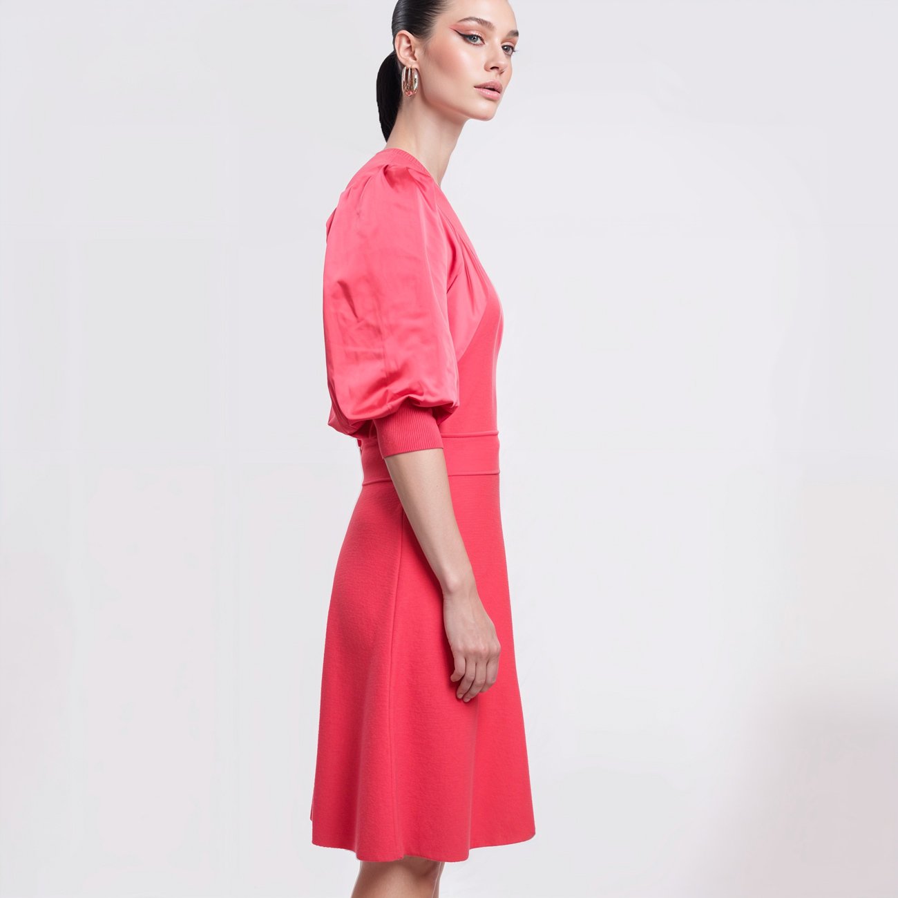 Il corpo del vestito è realizzato in maglia morbida ed elasticizzata (40% viscosa, 38% poliammide, 11% lana, 11% elastano), mentre le maniche a sbuffo in raso tono su tono aggiungono un tocco elegante e contemporaneo. La gonna svasata e lo scollo tondo creano una linea armoniosa che valorizza la silhouette.