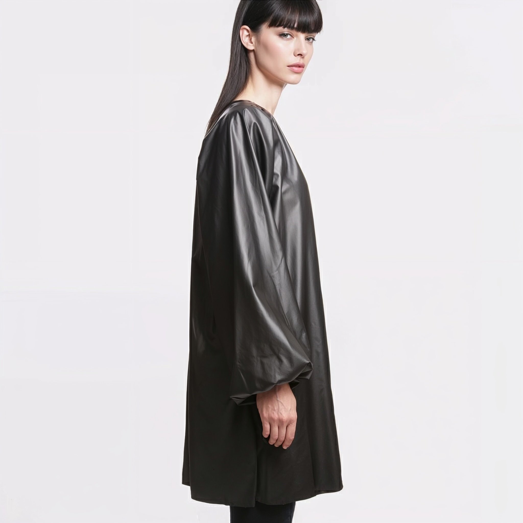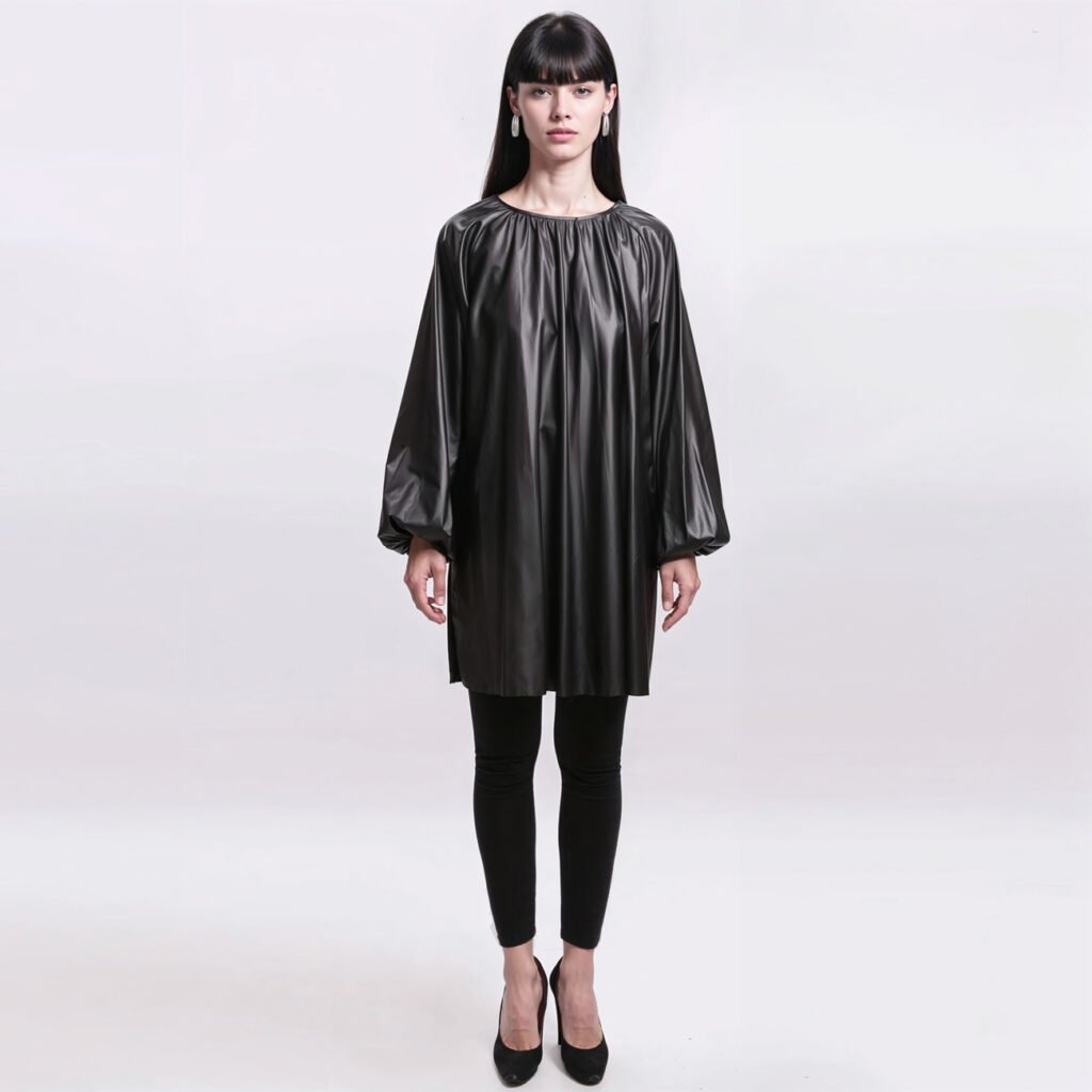 Realizzato in 100% poliestere effetto similpelle, questo abito similpelle nera donna presenta una texture elegante e strutturata, perfetta per outfit urbani e di tendenza. Il collo arricciato aggiunge un dettaglio raffinato, mentre le maniche lunghe ampie completano il look con un’estetica attuale e sofisticata.