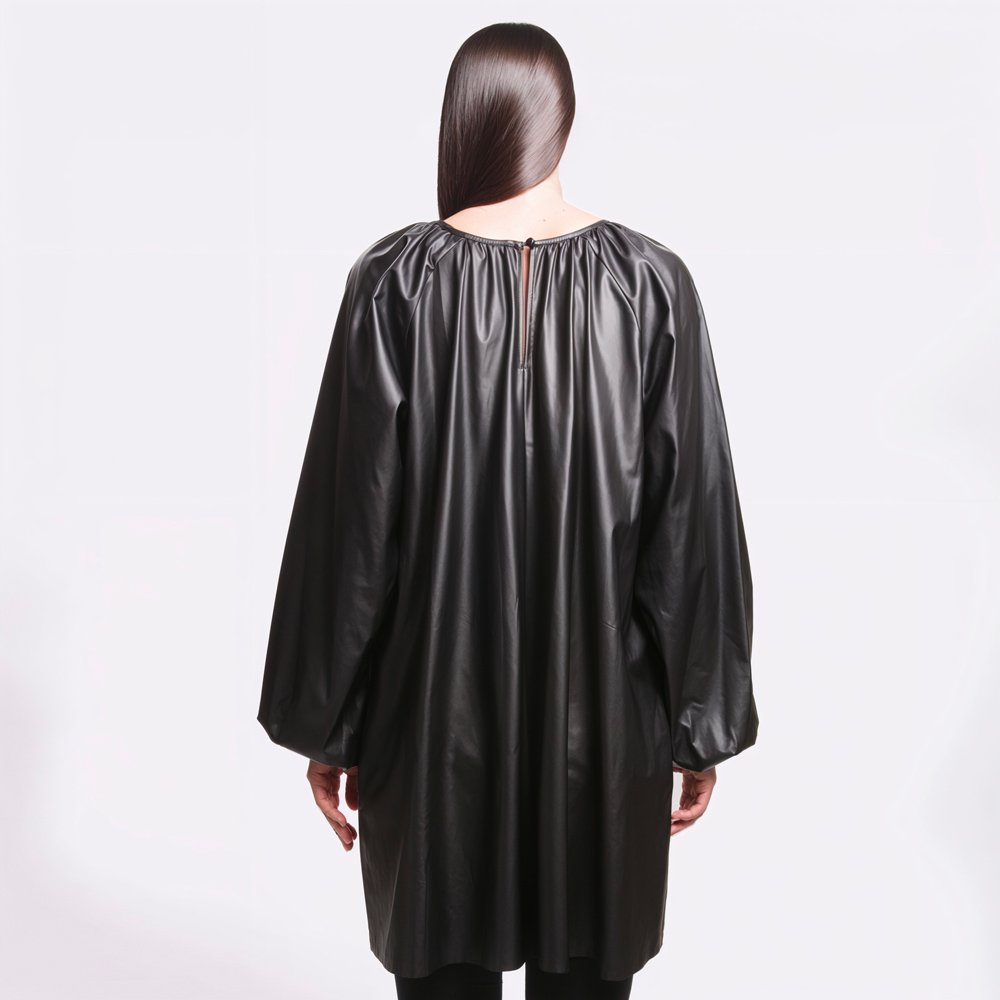 Abito similpelle nera donna Twinset Actitude con vestibilità oversize, maniche lunghe ampie e collo arricciato. Stile moderno e urbano.