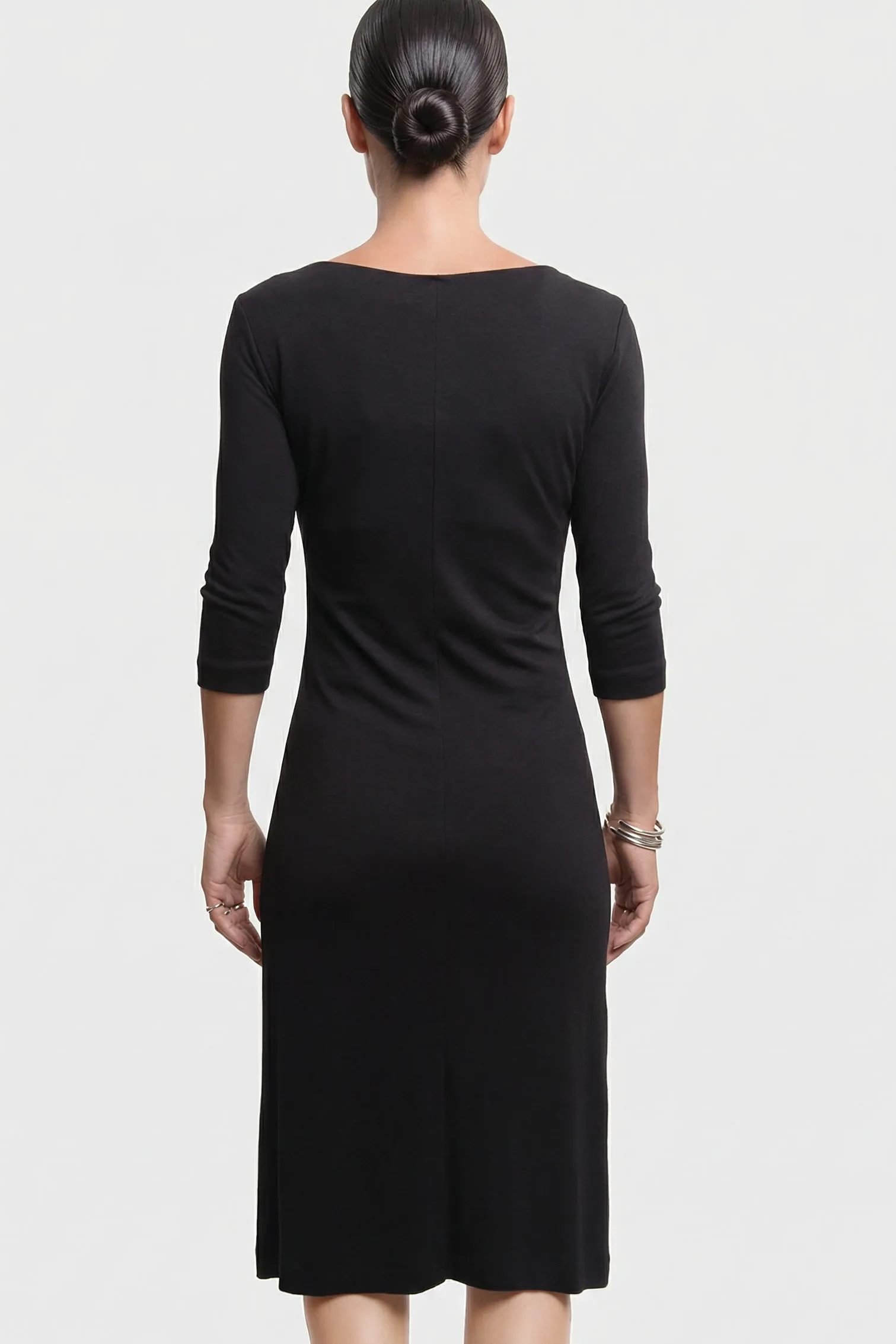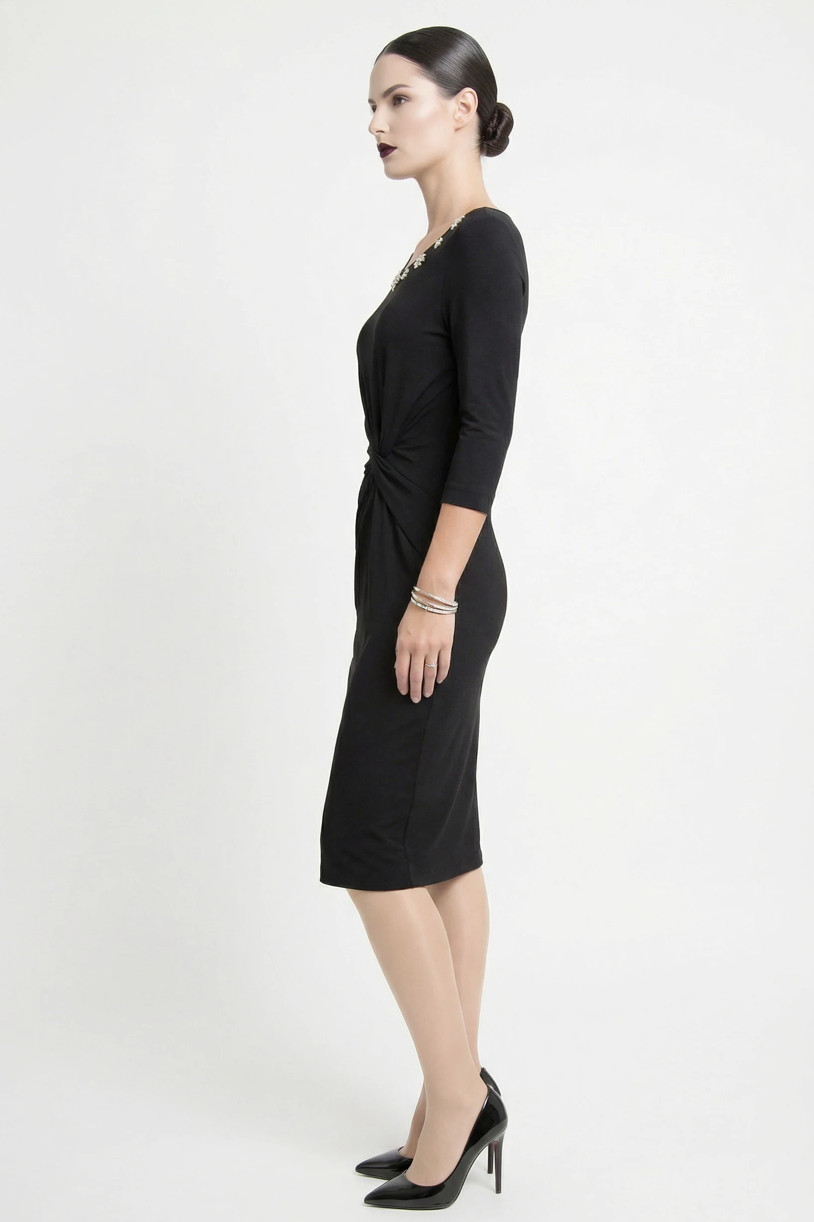 Drappeggio Strategico: Il nodo frontale non solo definisce il design, ma aggiunge un tocco dinamico e contemporaneo alla classicità del tubino.