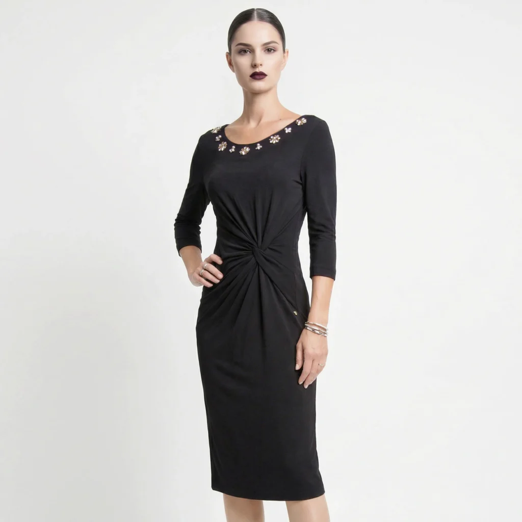 Questo modello si distingue per il raffinato scollo tondo, impreziosito da un’applicazione gioiello di cristalli e perle che illumina il volto, eliminando la necessità di ulteriori accessori. Il punto vita è valorizzato da un sapiente gioco di drappeggi e un nodo centrale che crea un movimento fluido, armonizzando la figura con estrema naturalezza. Realizzato in un pregiato mix di viscosa e lana, l’abito offre una mano morbida, calda e una caduta impeccabile, ideale per un look “Urban-Sophisticated” di alto livello.