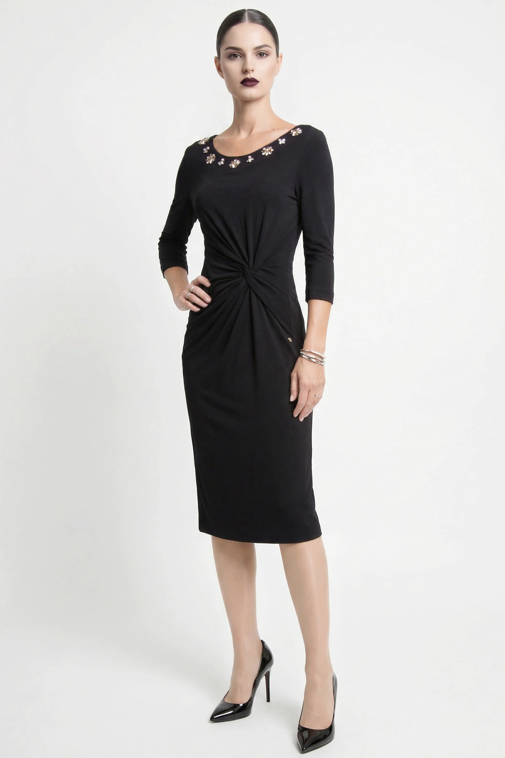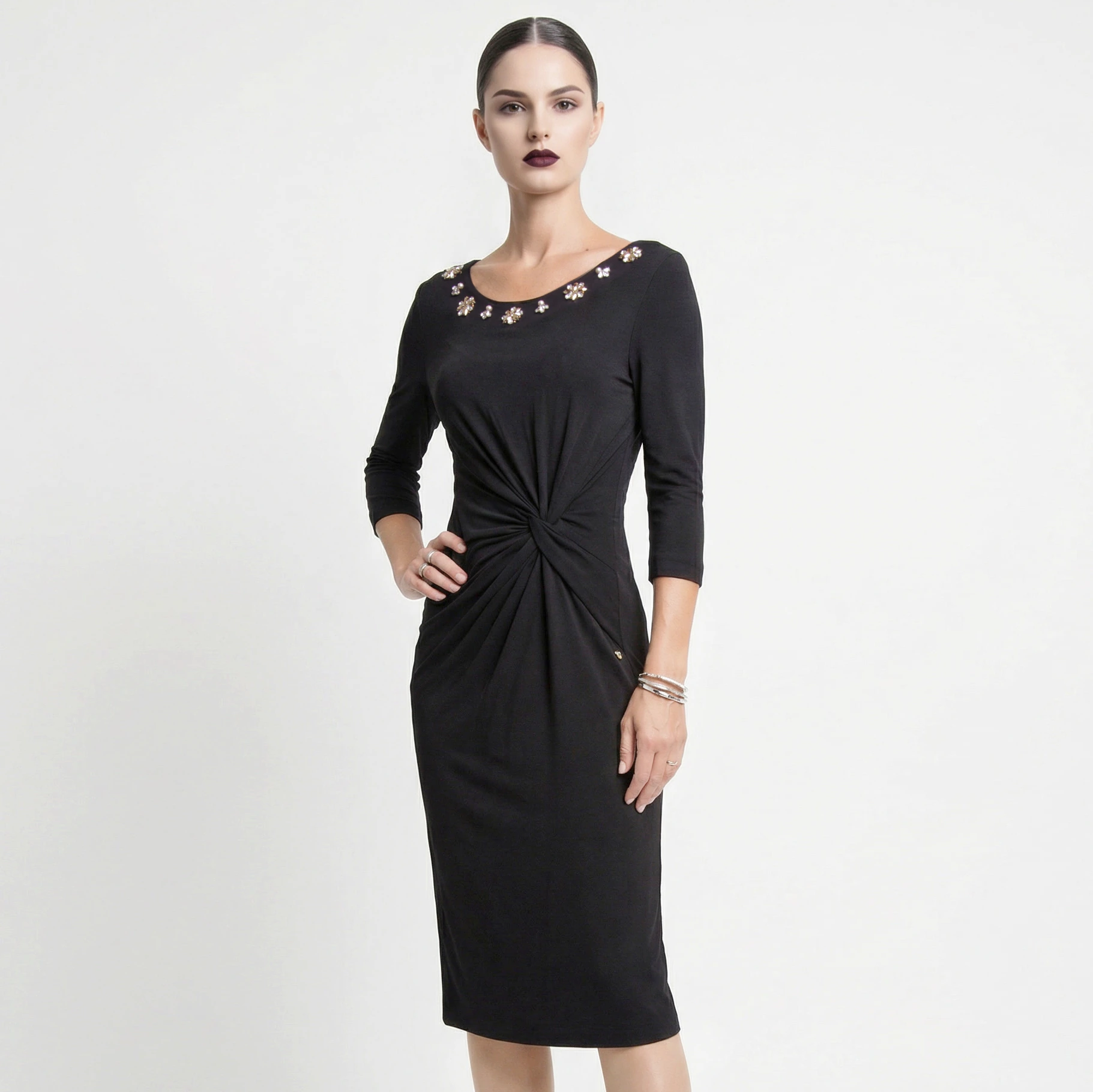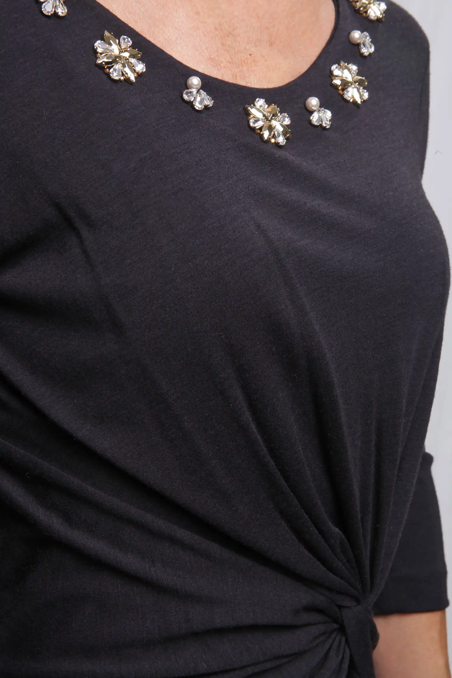 Dettagli: Applicazioni gioiello con cristalli e perle, drappeggio frontale, maniche a 3/4