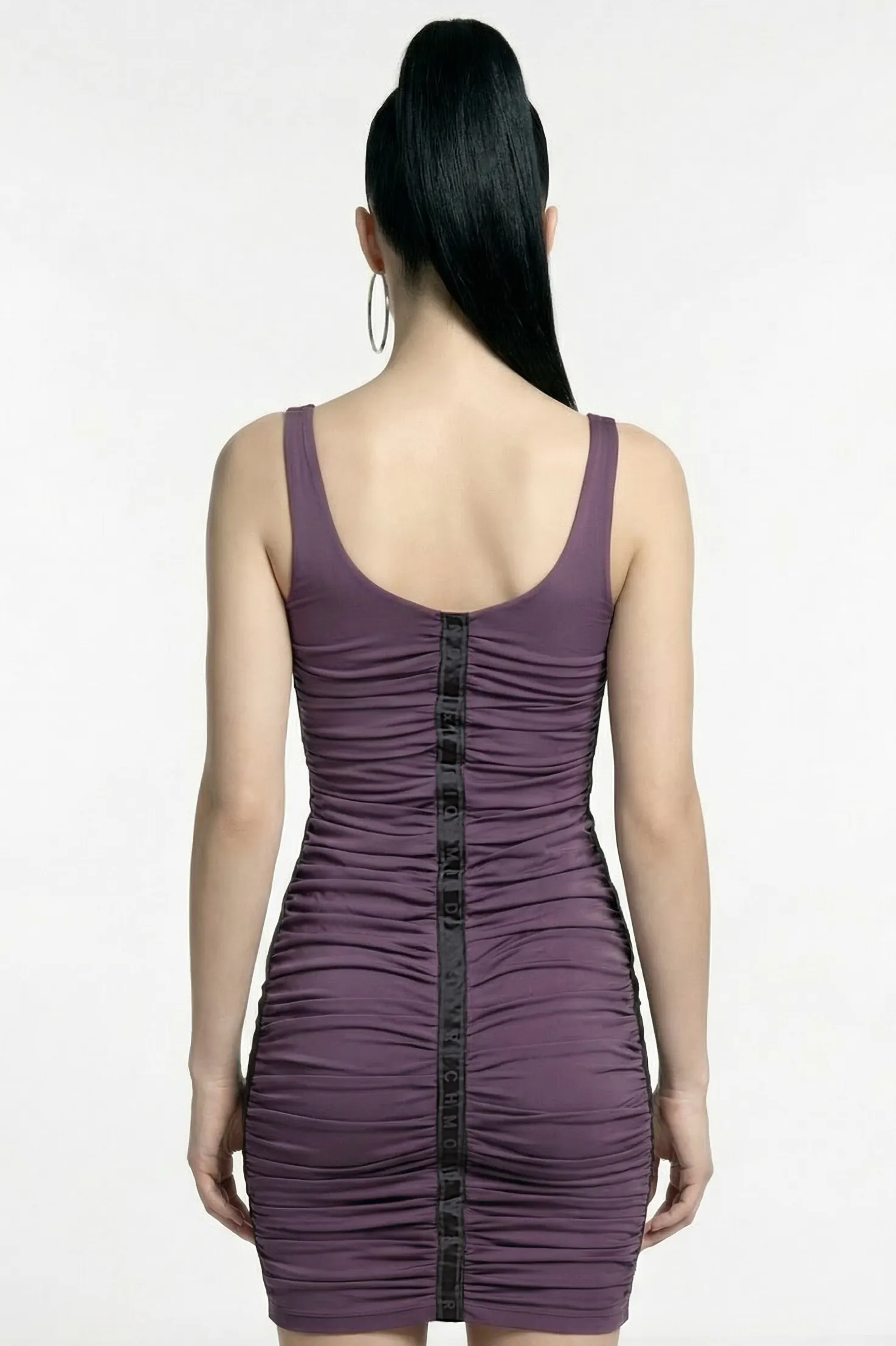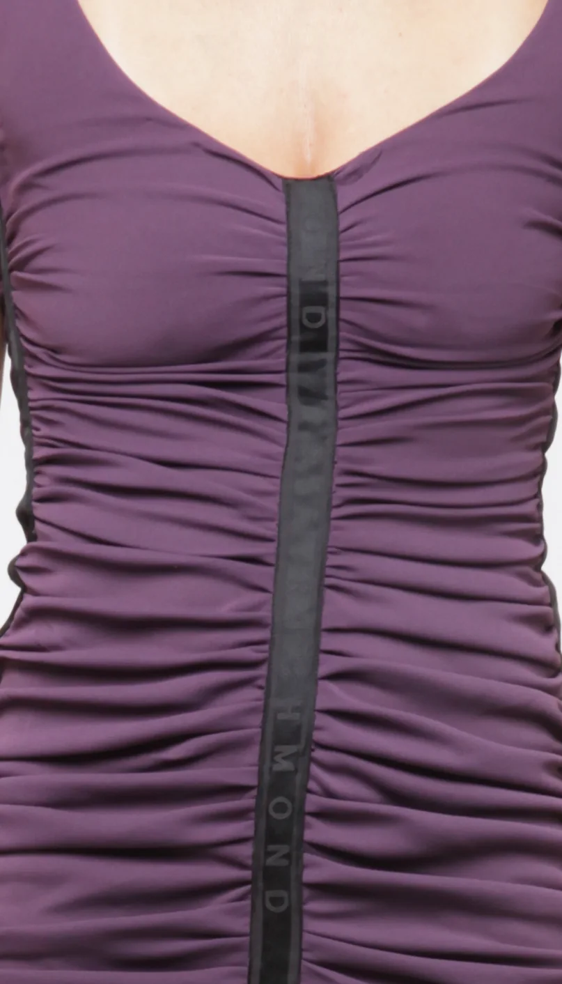 Vestito corto Richmond in tessuto stretch viola con arricciature centrali e bande nere con logo. Sensuale, moderno e perfetto per look da sera.